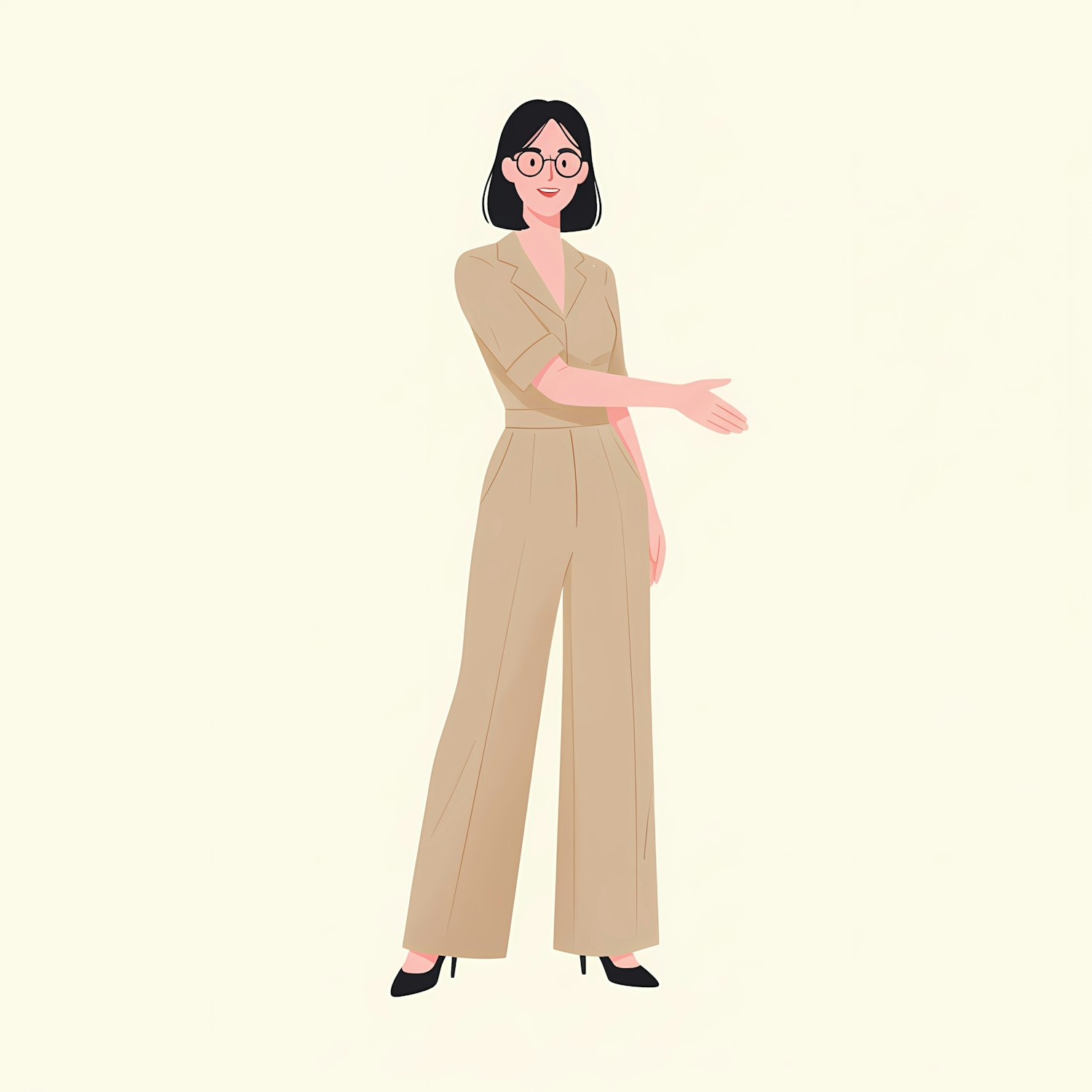 Illustration of a woman in a beige jumpsuit and glasses, extending her arm in a welcoming gesture, set against a light background.
