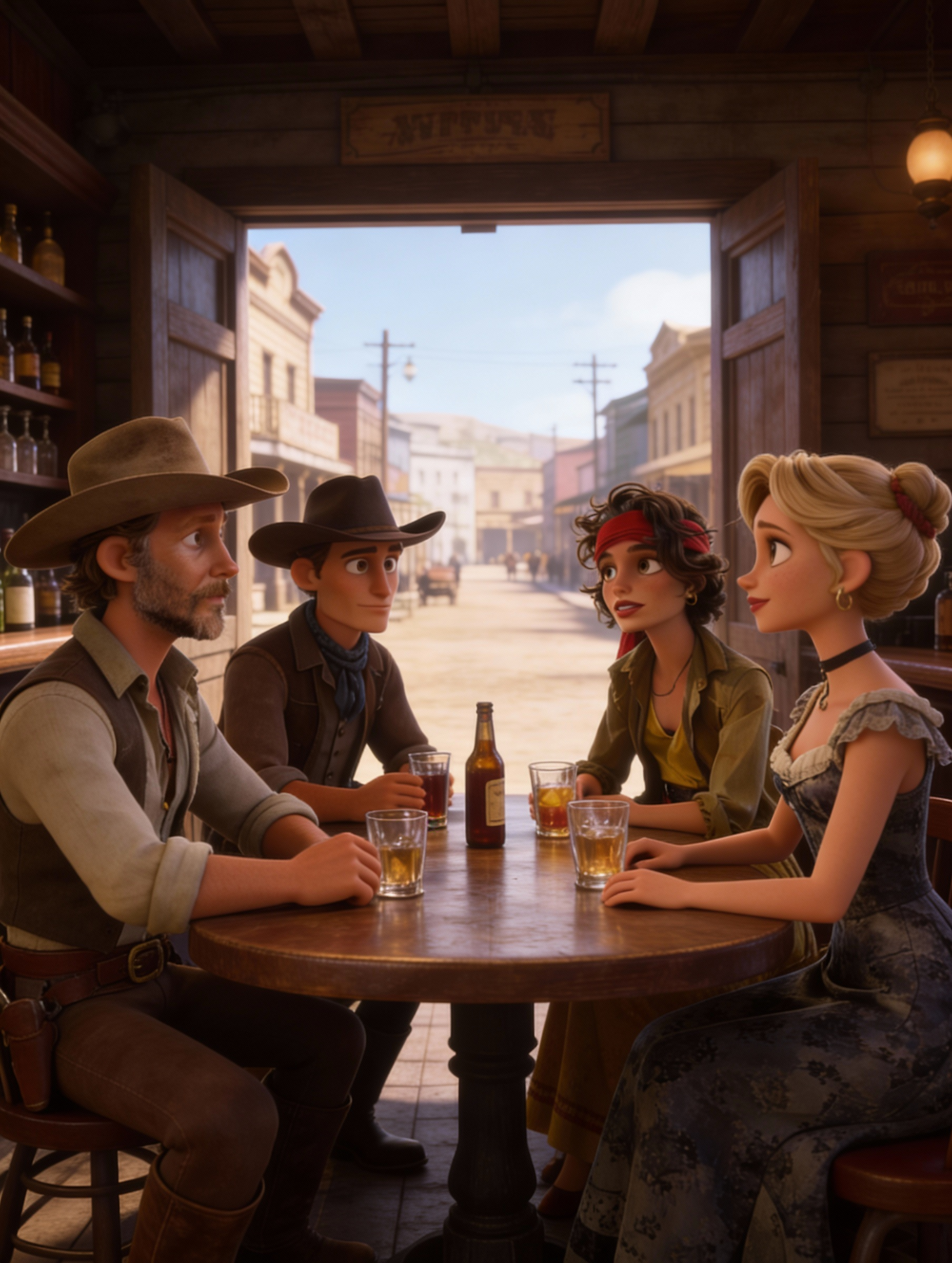Four animated characters in Western attire converse around a table in a saloon, with a small town visible through the open doorway.