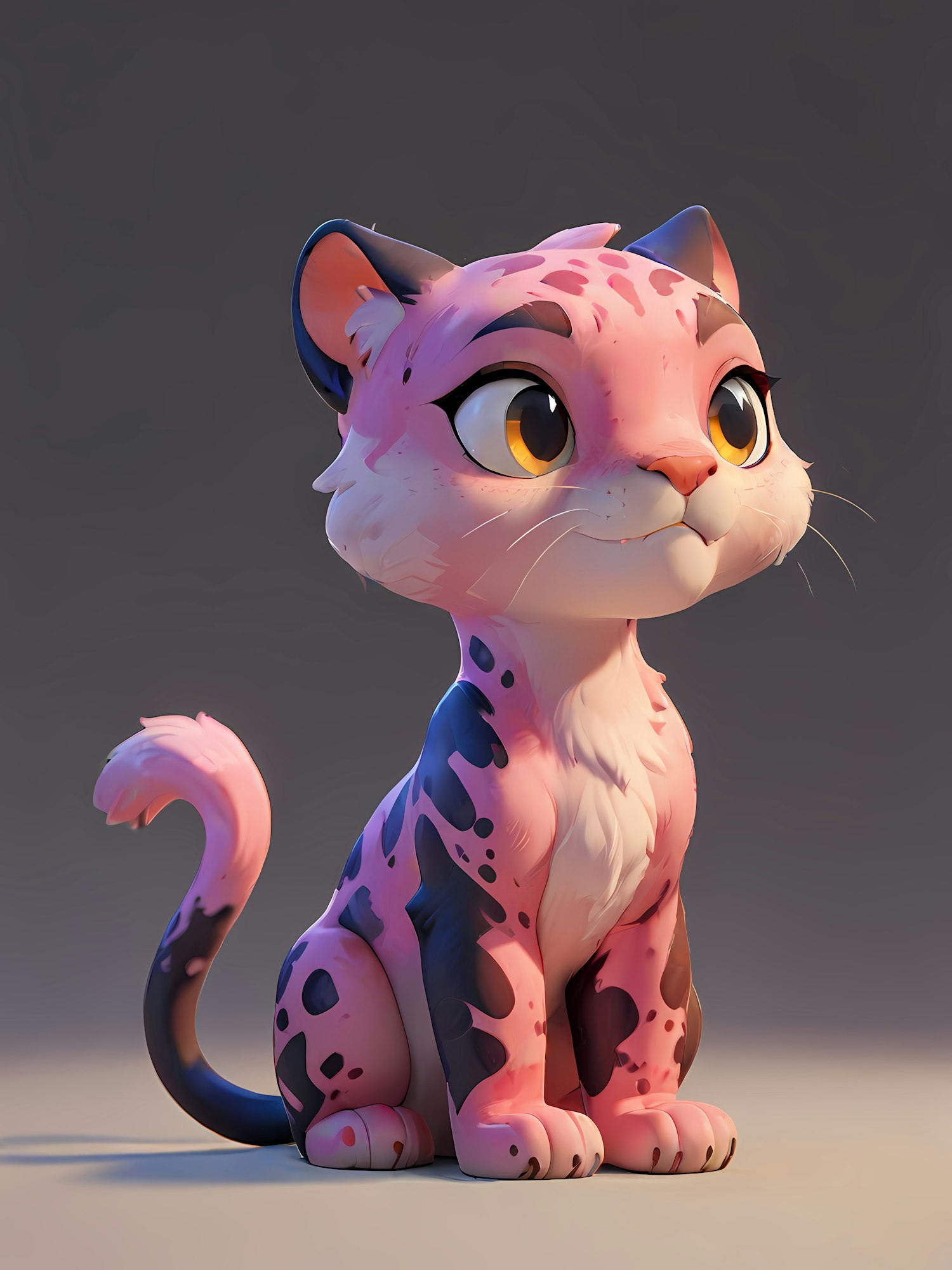 Adorable 3D-rendered pink and black spotted cat with golden eyes and a soft white chest, sitting gracefully in a neutral setting.