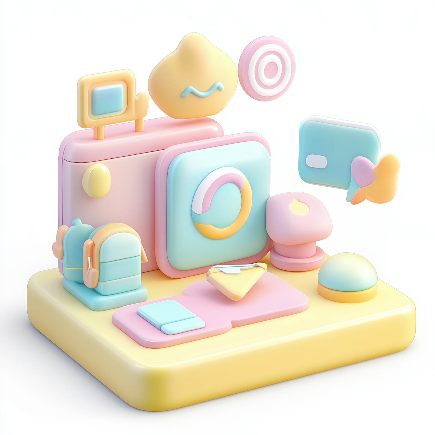 Whimsical 3D illustration with pastel objects like a camera, backpack, and abstract shapes in soft pinks, blues, and yellows.