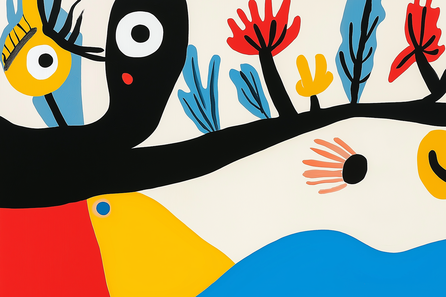 Colorful abstract illustration with bold shapes and vibrant colors, featuring black, yellow, red, and blue elements on a cream background.