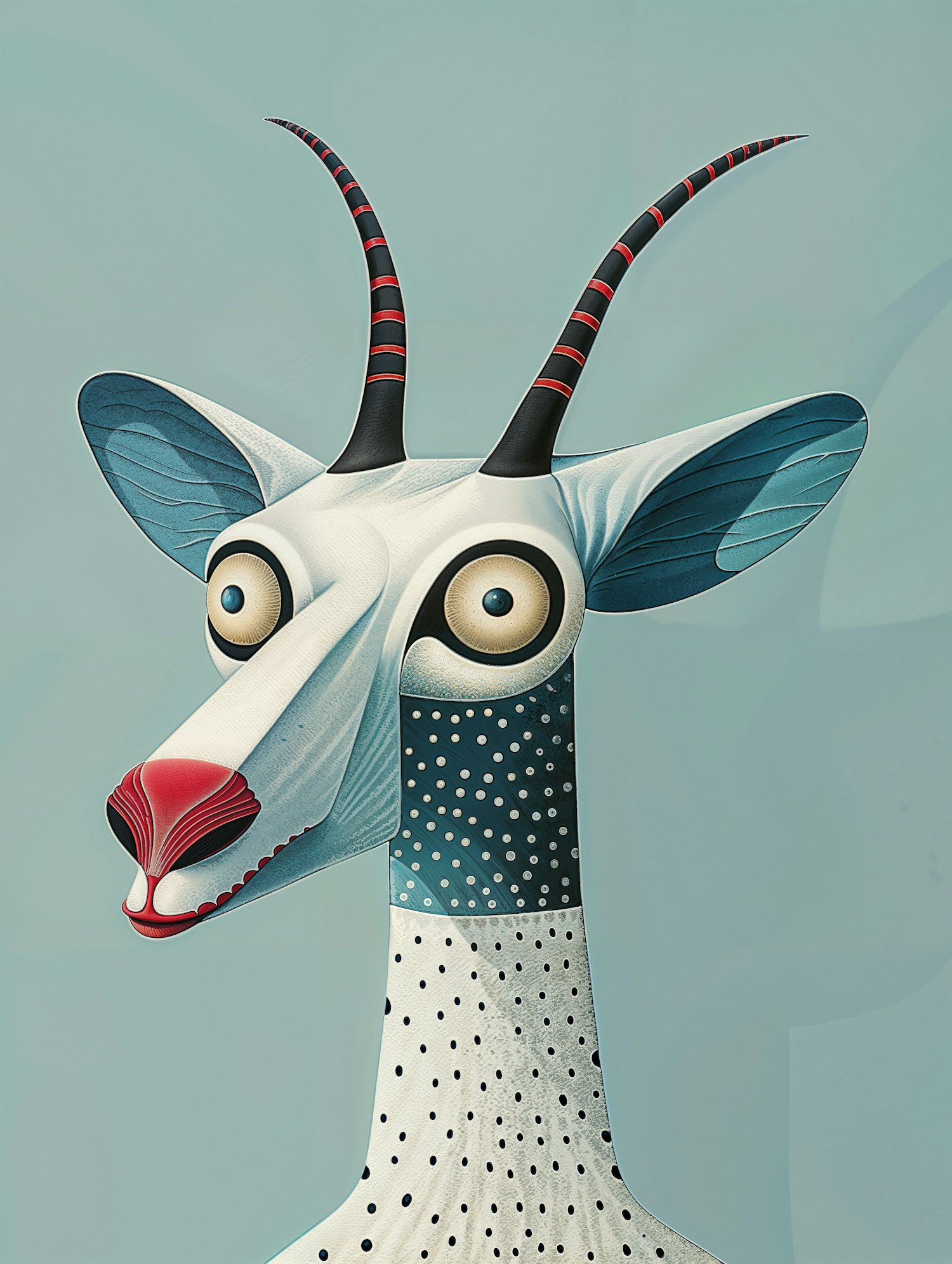 Whimsical illustration of a stylized antelope with striped horns, polka-dotted body, and a vibrant red nose on a soft blue background.