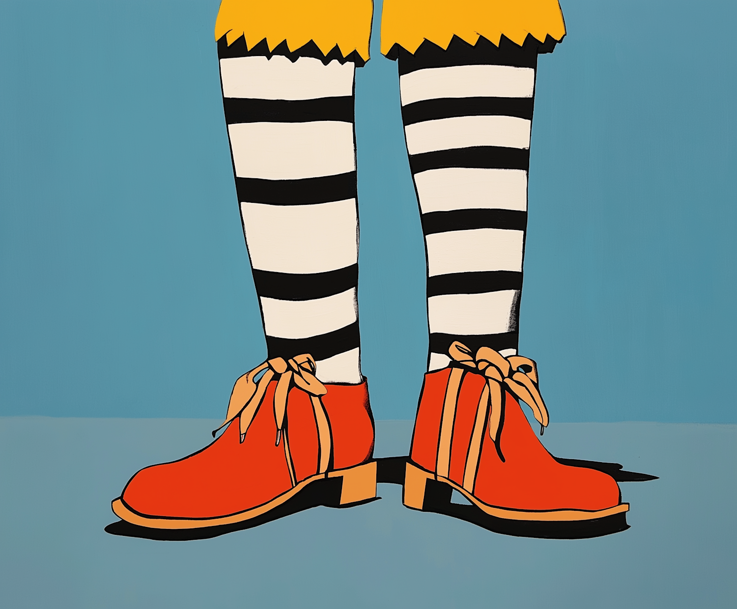 Whimsical illustration of striped stockings and red shoes with large laces on a blue background, featuring a yellow garment.