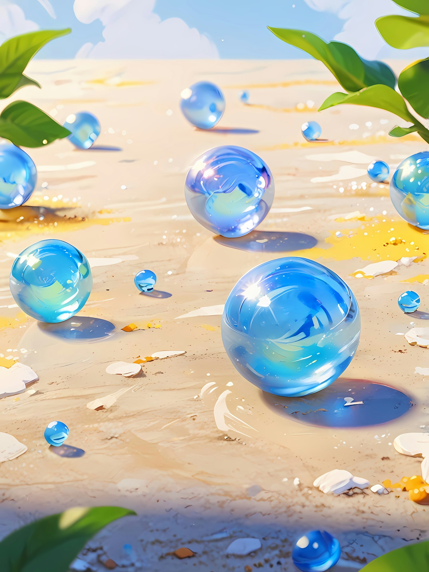 Whimsical beach scene with reflective blue spheres on sand, framed by green leaves and a sunny sky with fluffy clouds.