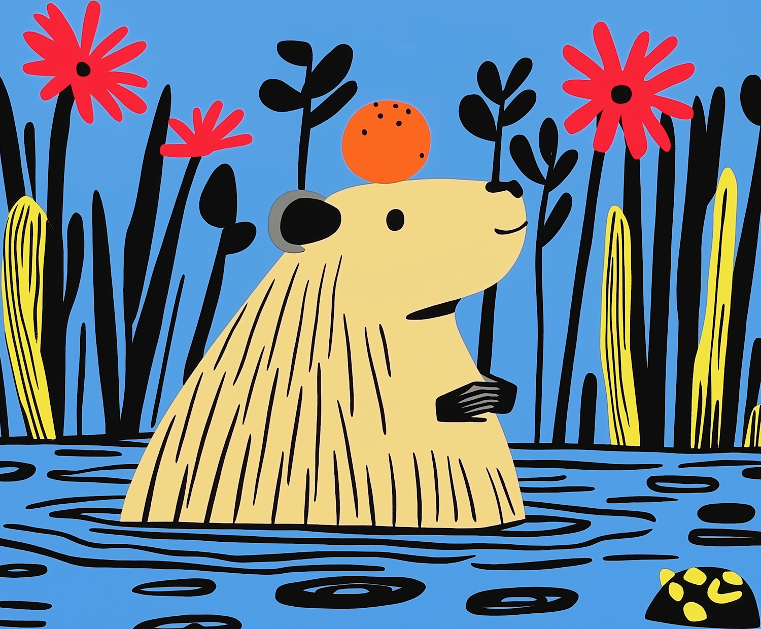 Whimsical capybara illustration with orange fruit on head, surrounded by vibrant red flowers and a small turtle in a blue pond.