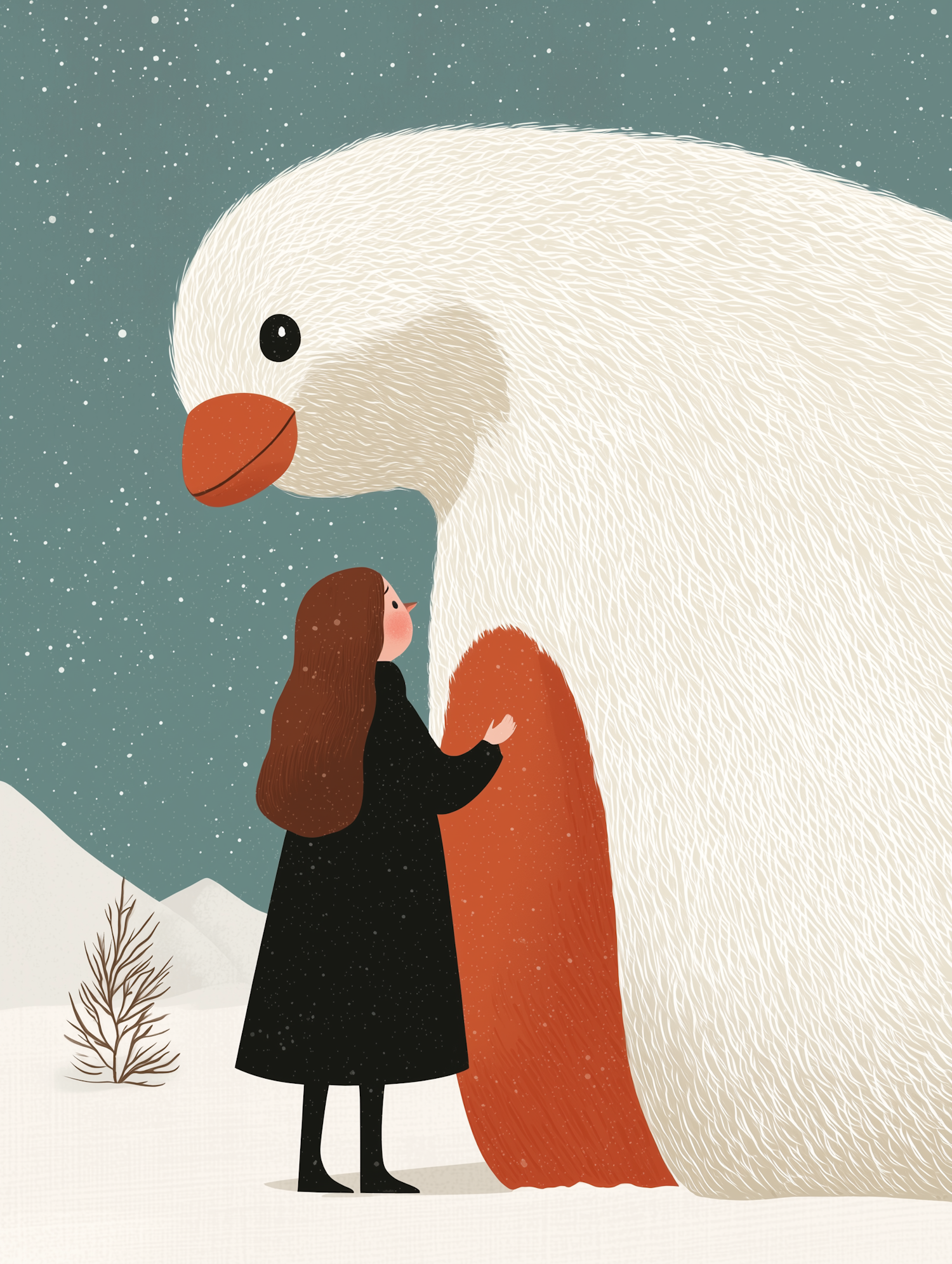 A girl in a black coat touches a giant white goose in a snowy landscape, creating a whimsical and magical scene.