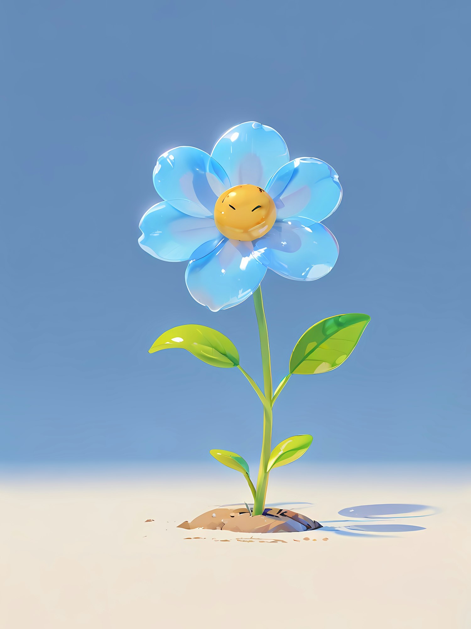A cute 3D blue flower with a smiling yellow face, glossy petals, and green leaves on a sandy surface with a blue background.
