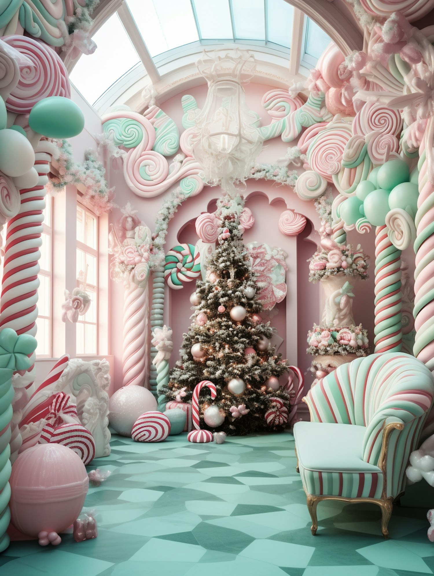 Whimsical candy-themed room with pastel swirls, a Christmas tree, and mint-pink decor, creating a festive and fantastical atmosphere.