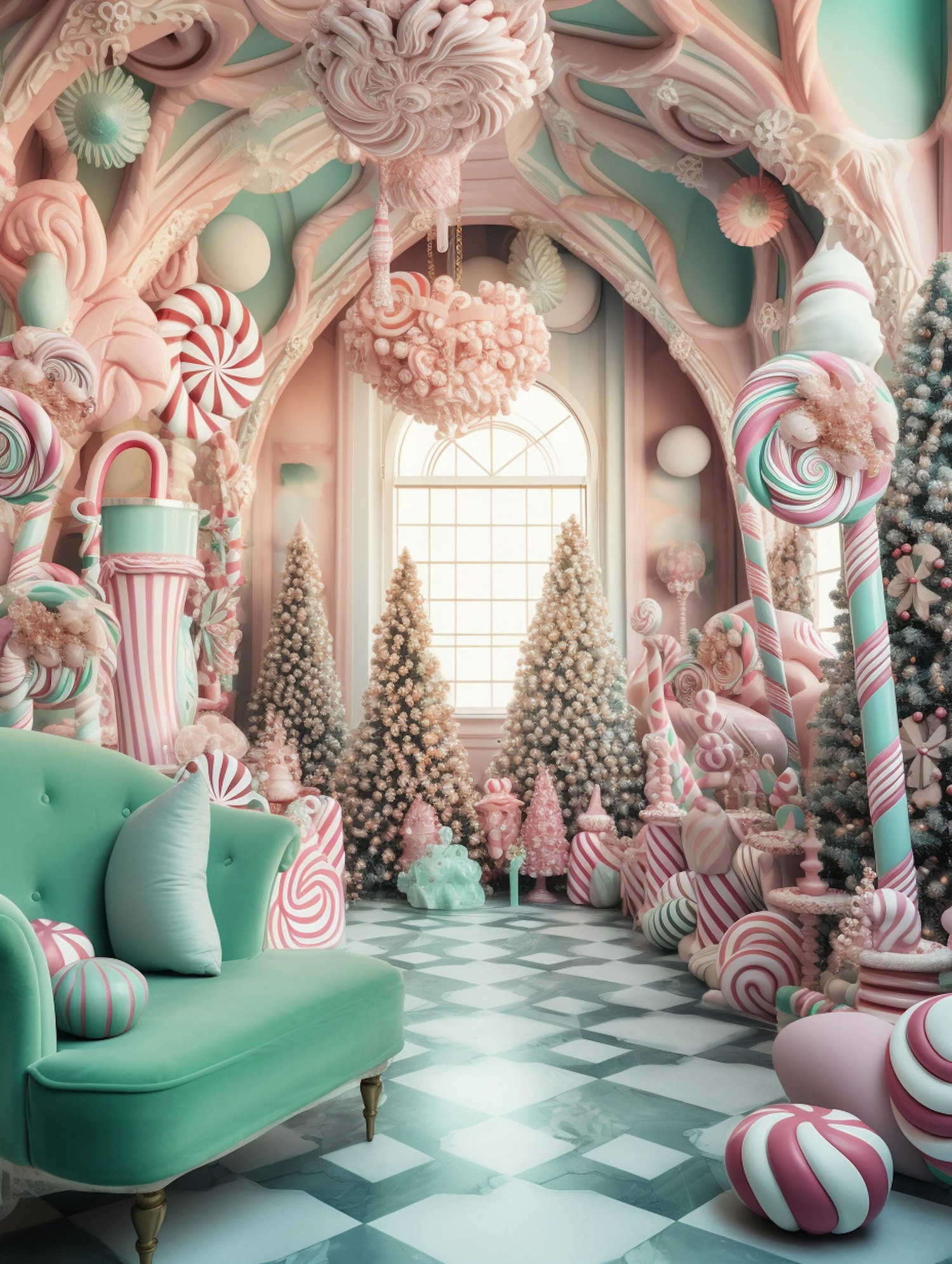 Whimsical candy-themed room with pastel colors, oversized sweets, and festive decor, creating a dreamy and fantastical atmosphere.