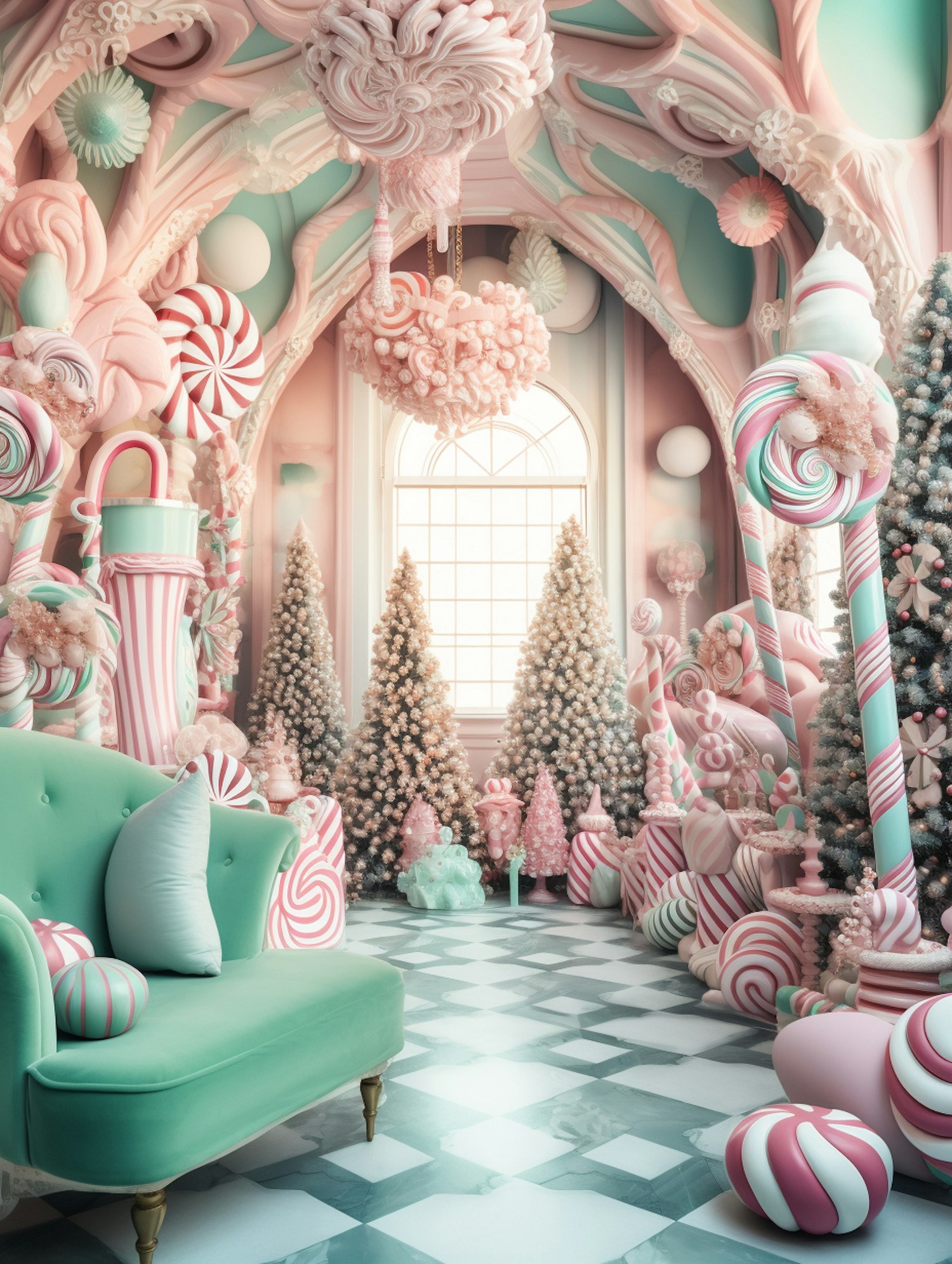Whimsical candy-themed room with pastel colors, candy canes, and lollipops. Mint green sofa and festive trees create a magical atmosphere.