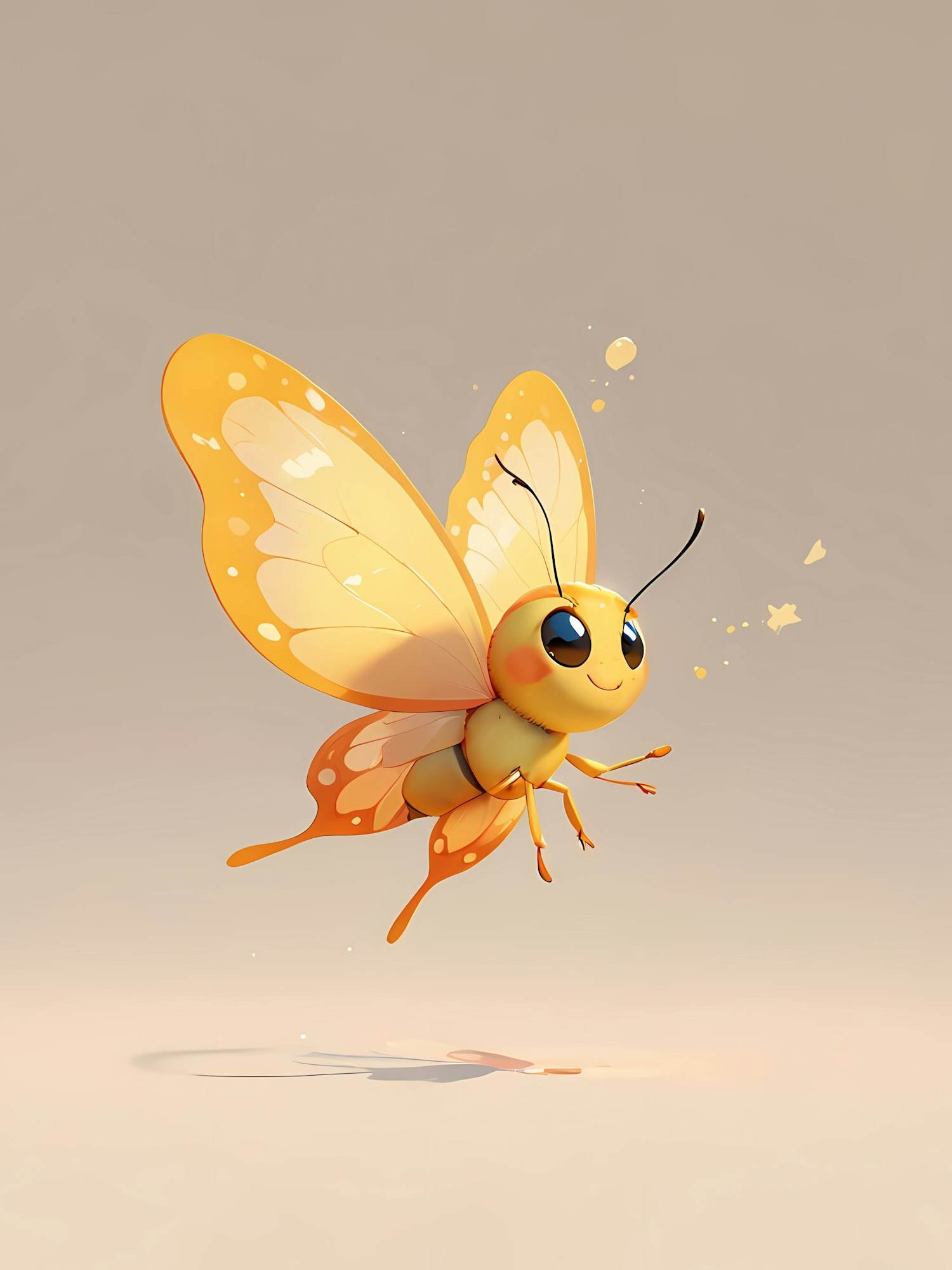 Adorable cartoon butterfly with glowing orange-yellow wings and big blue eyes, flying in a soft beige background. Perfect for whimsical designs.