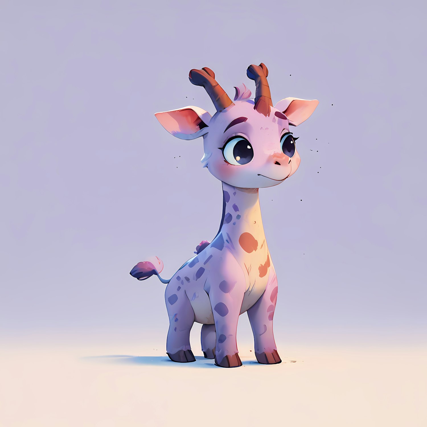 Adorable cartoon giraffe with purple and pink spots, large eyes, and a playful expression on a soft background.