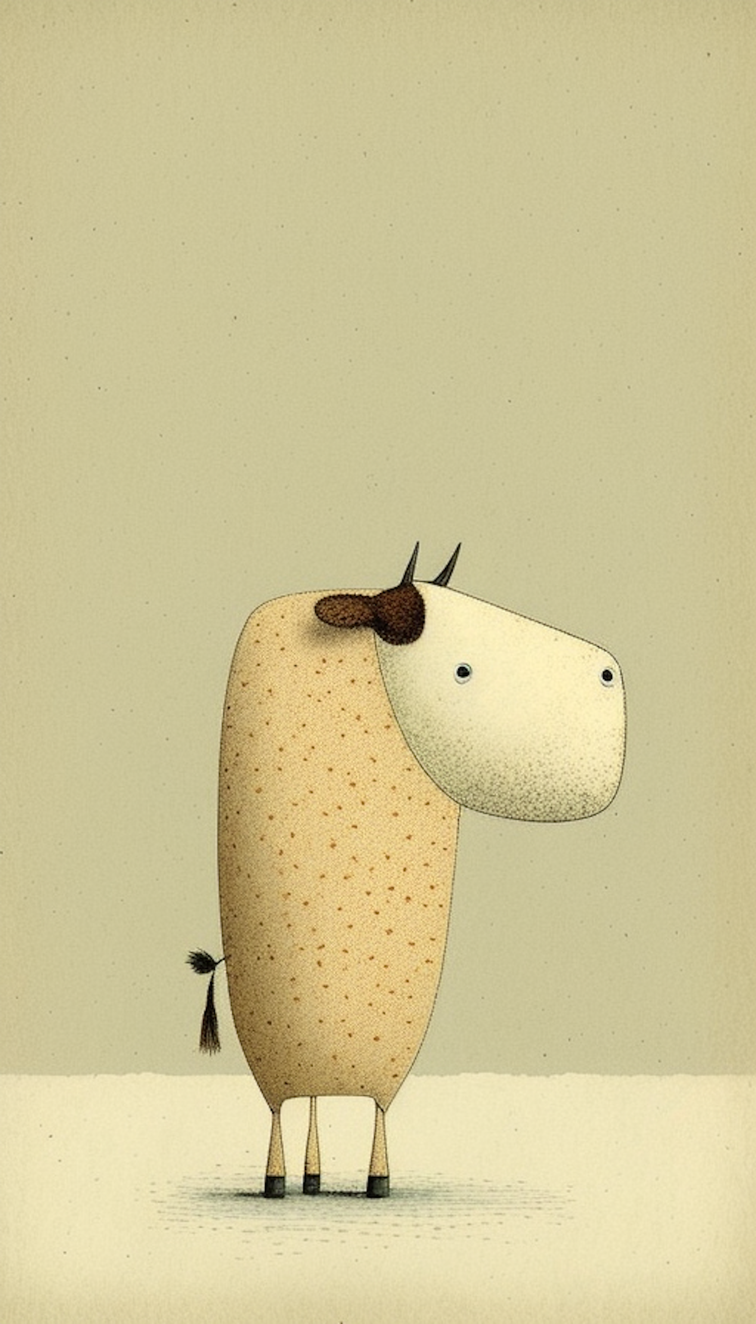 Whimsical illustration of a stylized cow with a rectangular body, small spots, and a cartoonish charm on a soft beige background.