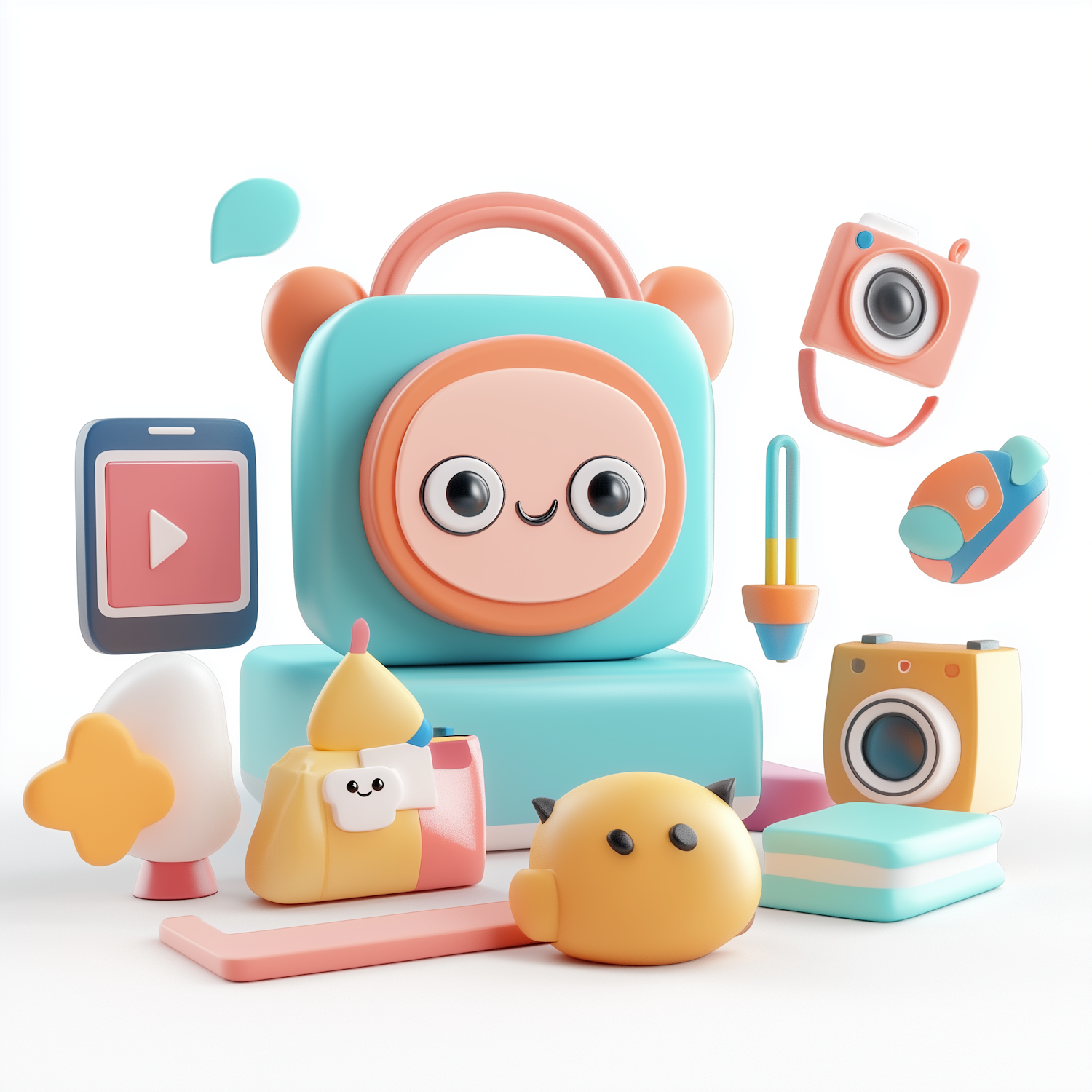 Colorful 3D illustration of playful cartoon objects in pastel hues, featuring a smiling character and whimsical elements.