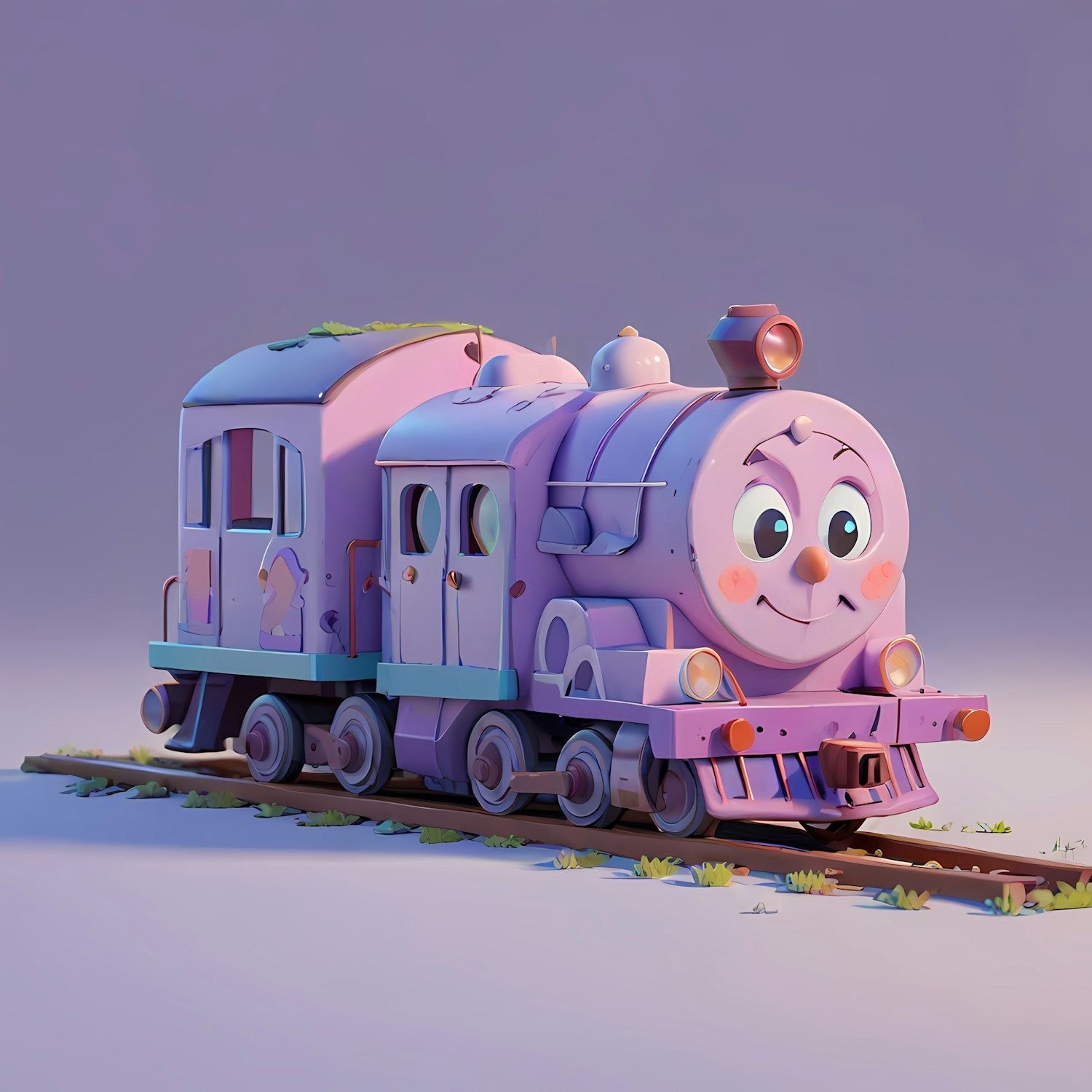 Charming 3D cartoon train with a smiling face in pastel colors on a track with grass, set against a purple gradient background.