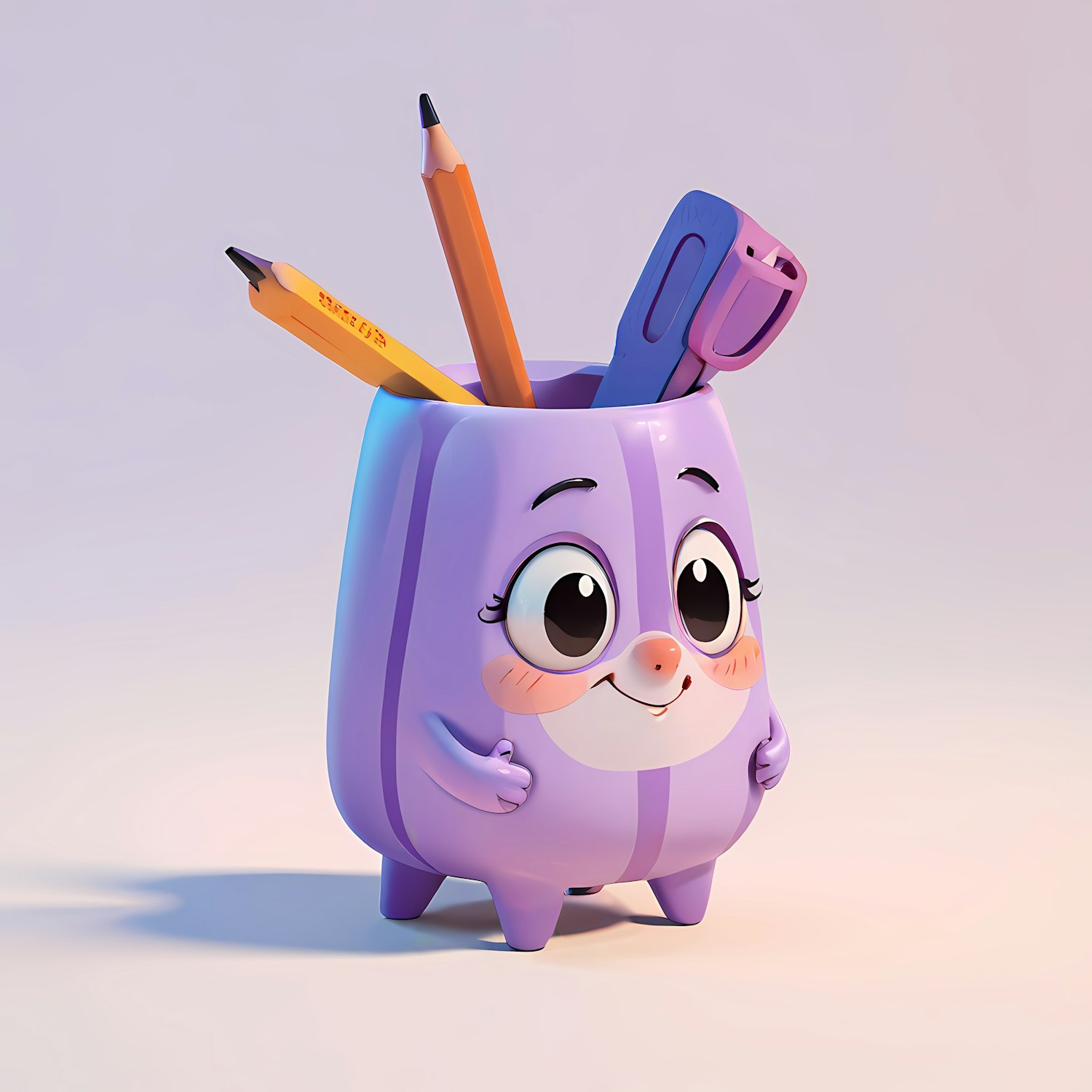 Cute purple pencil holder with a face, holding pencils and pens. Whimsical design with big eyes and rosy cheeks on a light background.