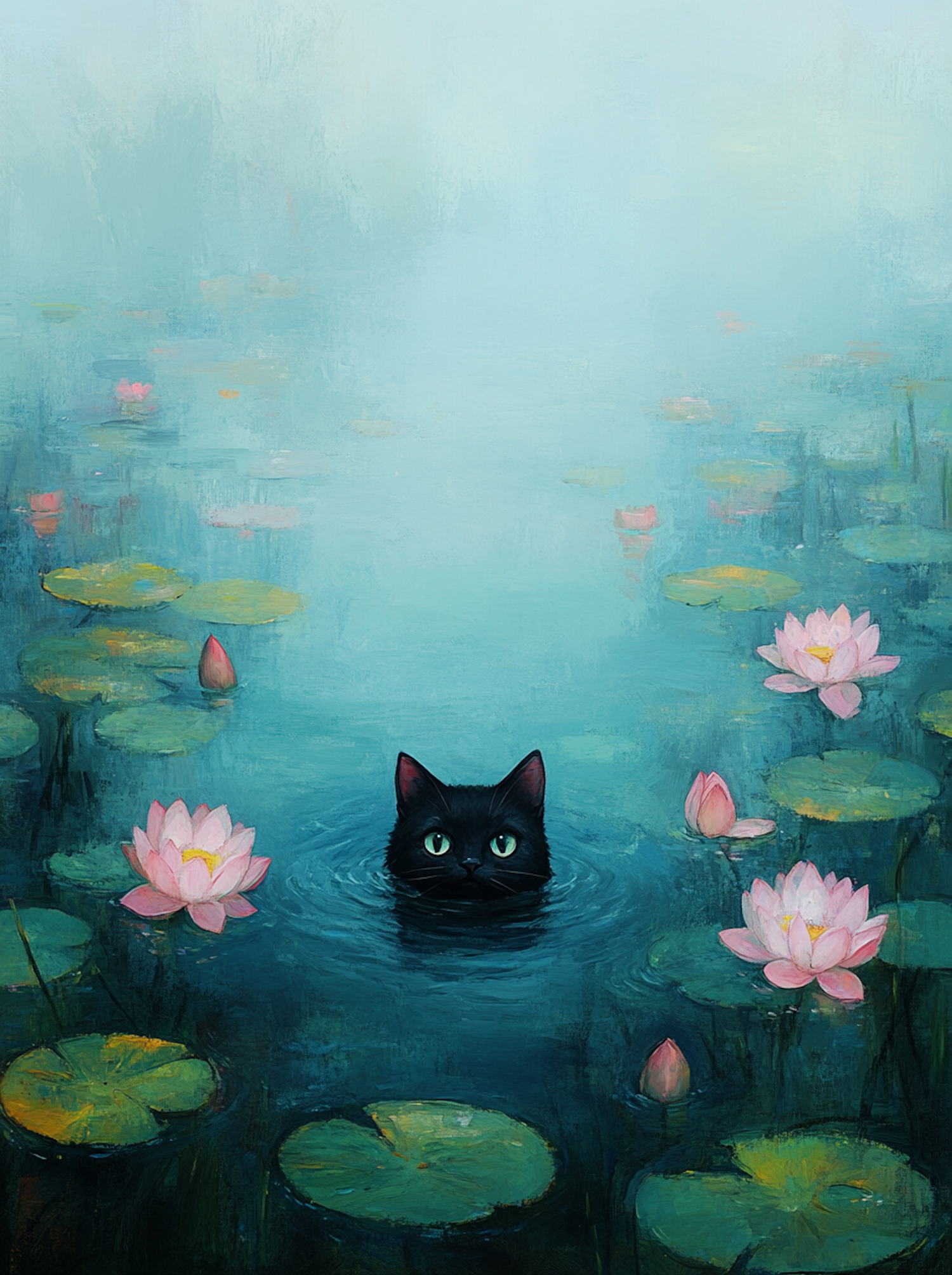 A black cat with green eyes peeks from a pond surrounded by pink lotus flowers and lily pads, set against a misty blue background.