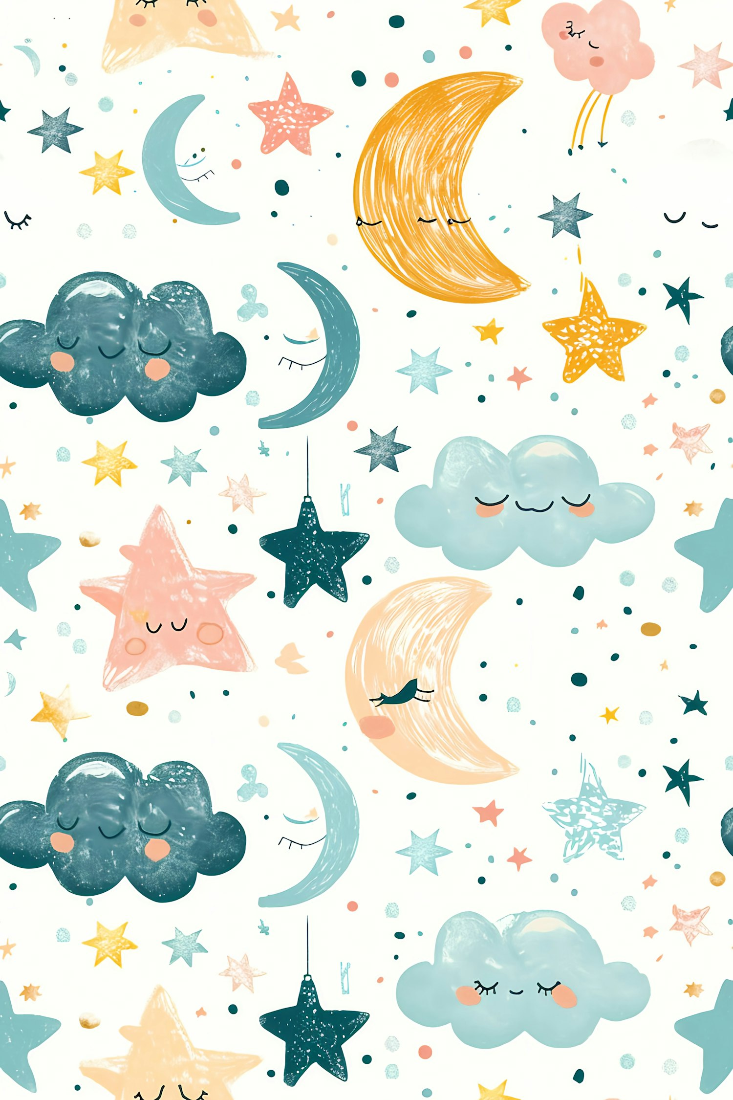 Whimsical celestial illustration with smiling clouds, stars, and moons in pastel colors on a light background.