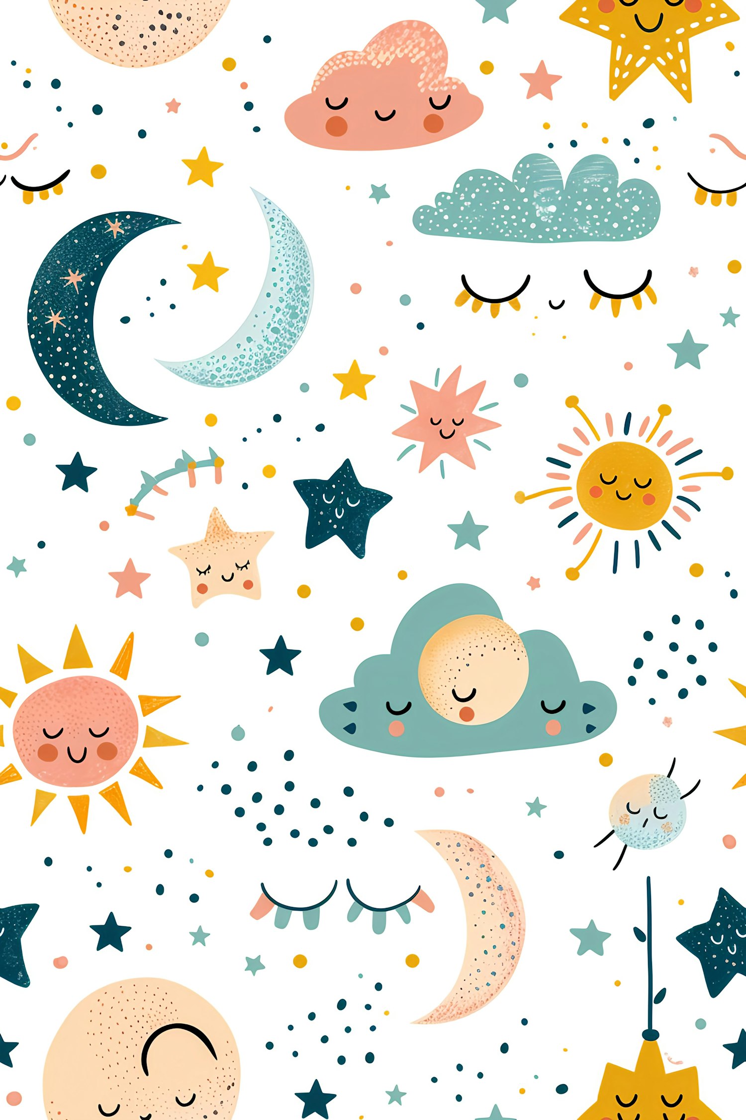 Whimsical celestial illustration with smiling stars, moons, clouds, and suns on a white background. Playful and serene design.