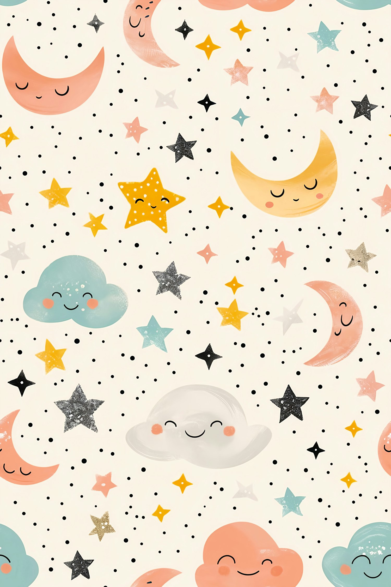 Whimsical celestial pattern with smiling moons, stars, and clouds on a cream background. Perfect for nursery decor.