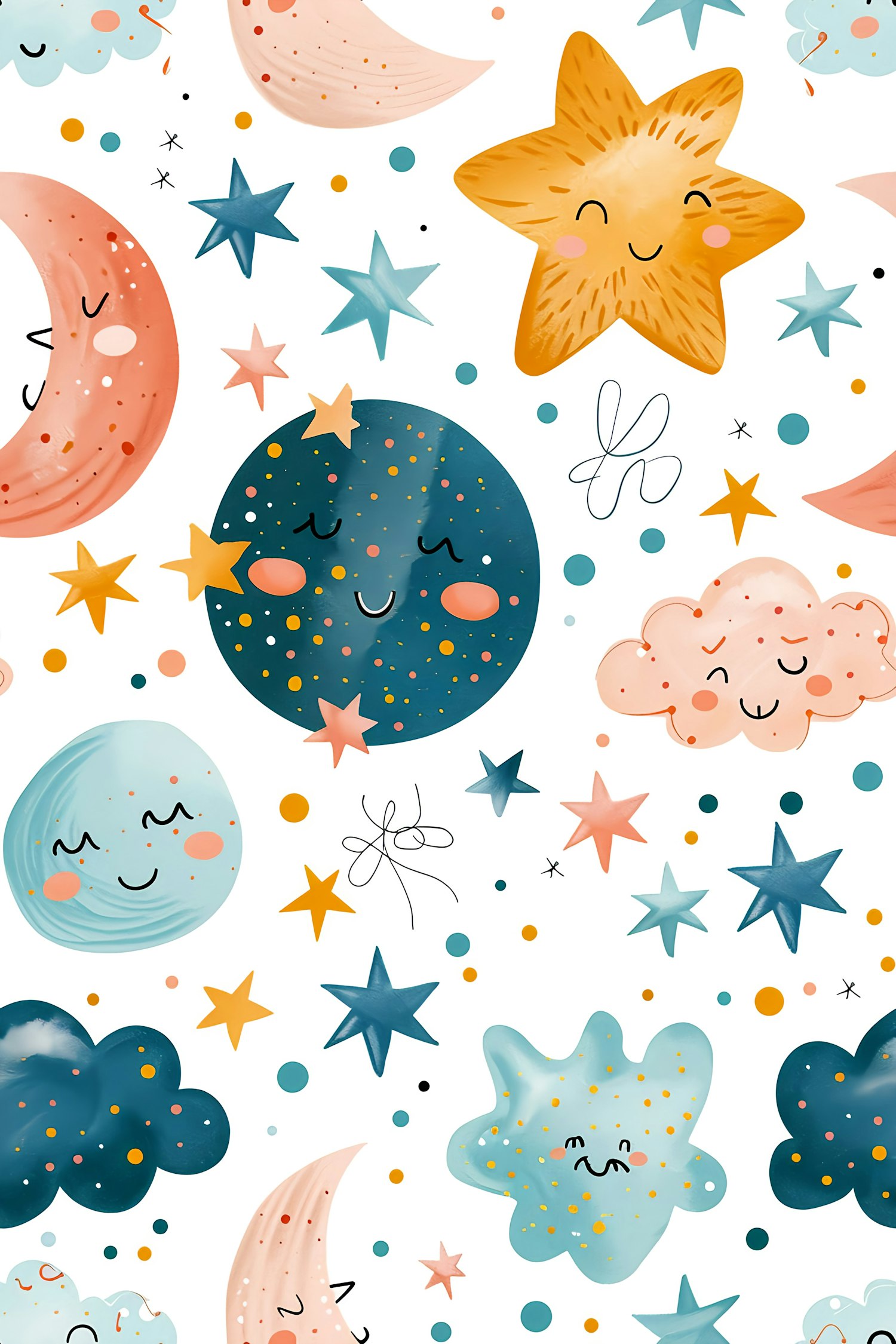 Whimsical celestial illustration with smiling stars, planets, and clouds in vibrant colors on a white background.