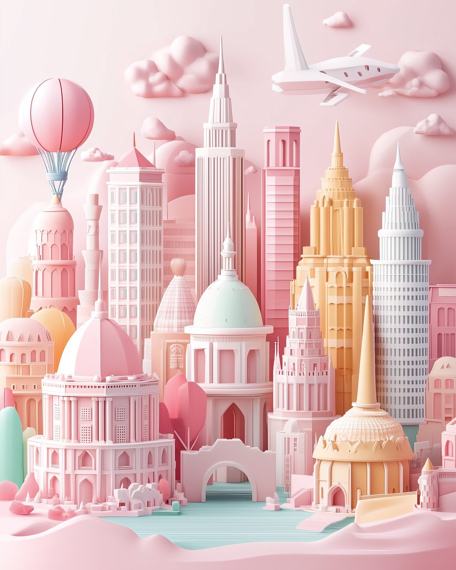 A pastel 3D cityscape with iconic landmarks, a hot air balloon, and an airplane, creating a dreamy and whimsical travel vibe.