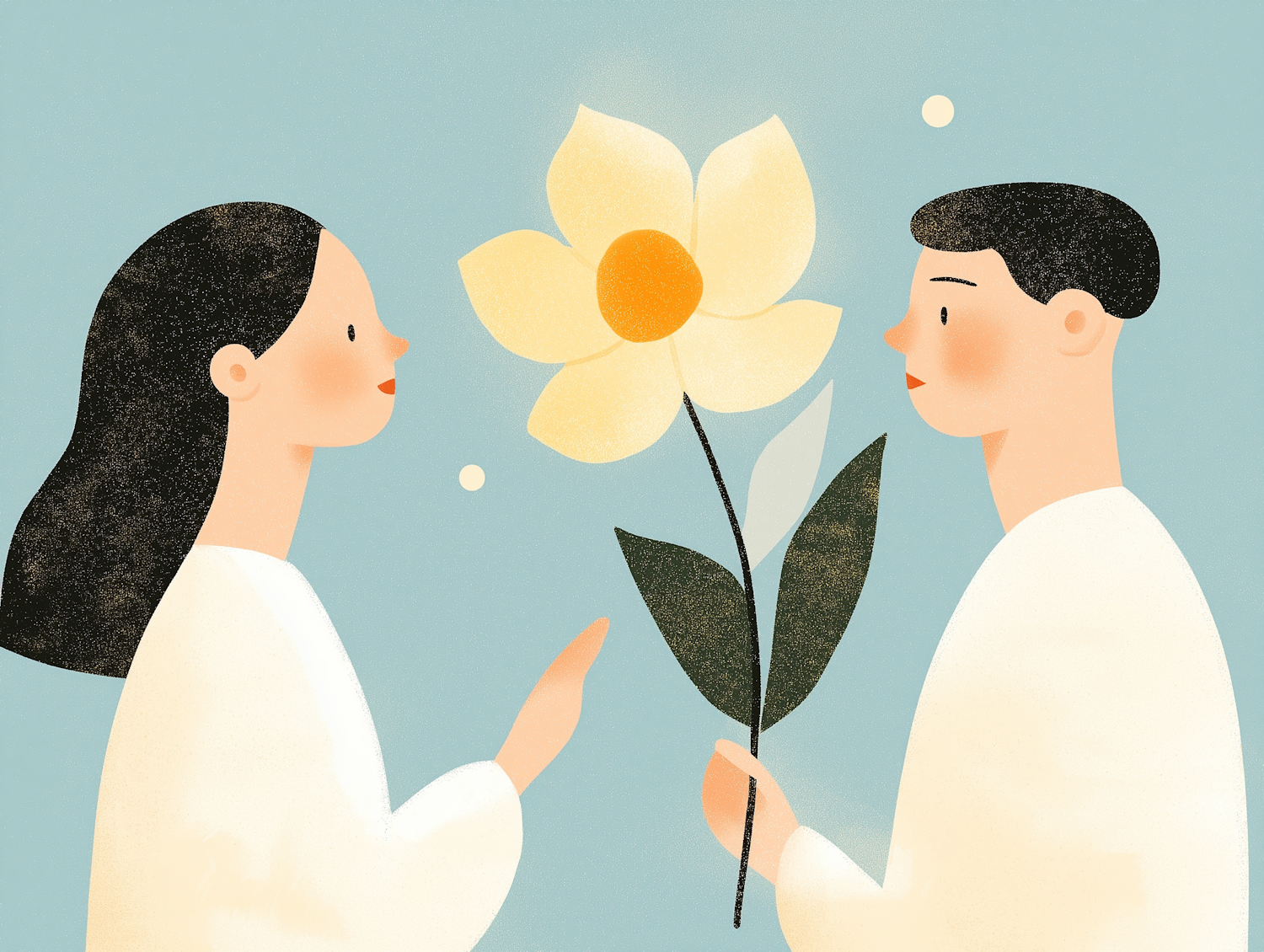 Minimalist illustration of two people exchanging a large yellow flower, set against a soft blue background.