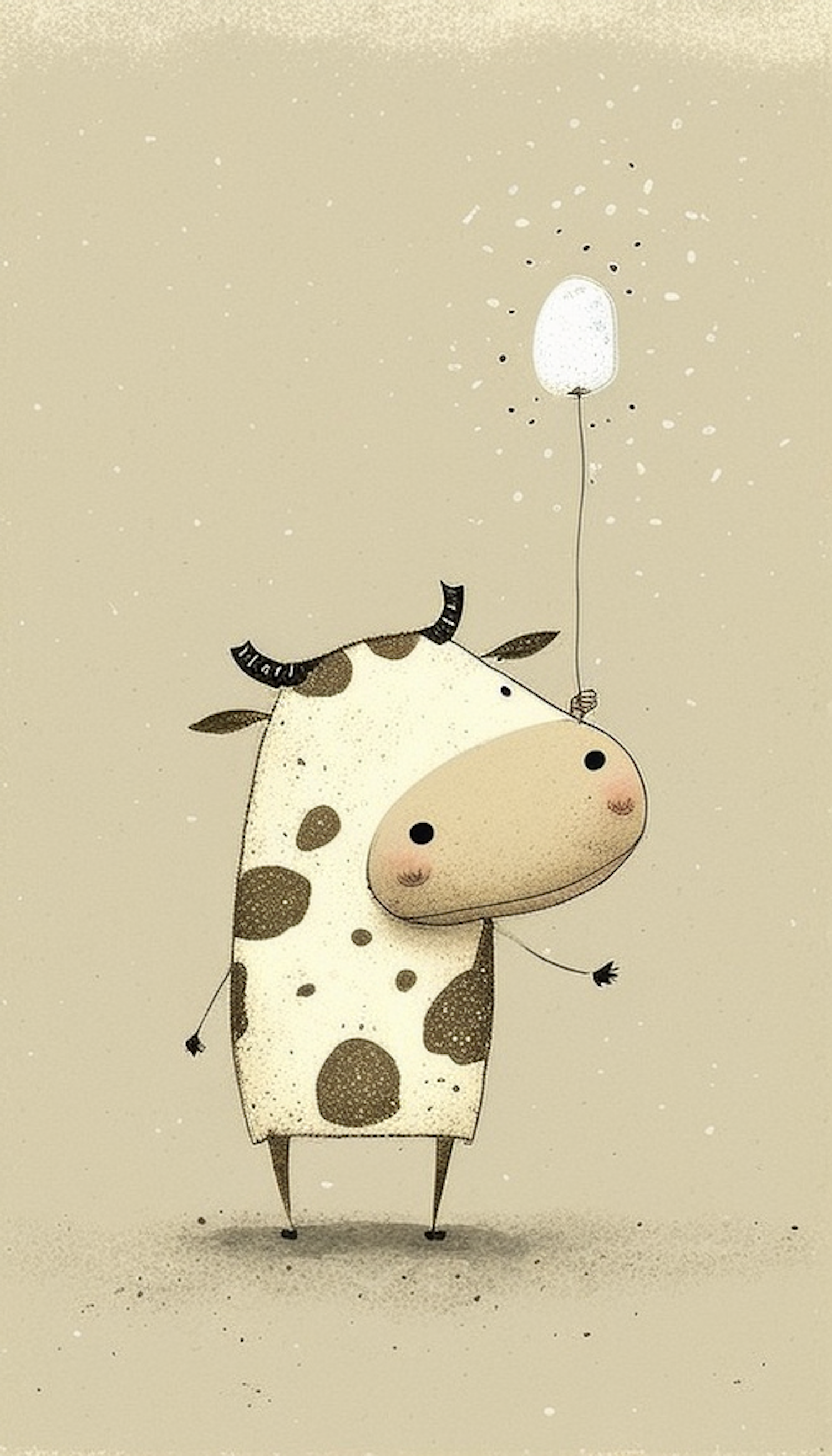 Charming cartoon cow holding a white balloon against a beige background, featuring playful spots and a whimsical design.