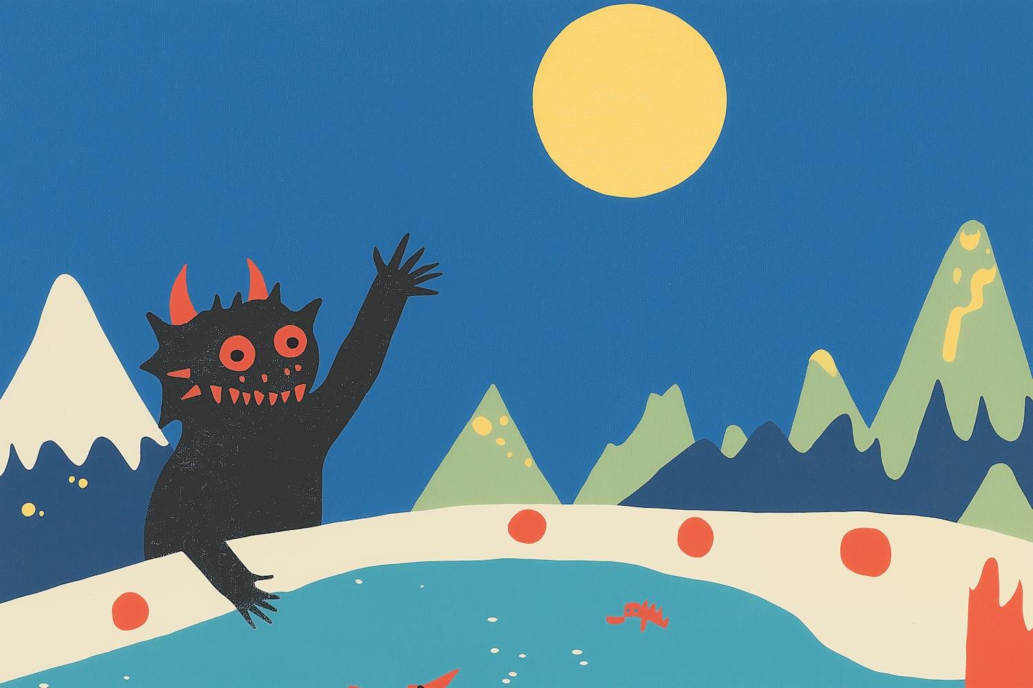 Whimsical illustration of a black creature with red eyes waving in a colorful mountain landscape under a bright sky.