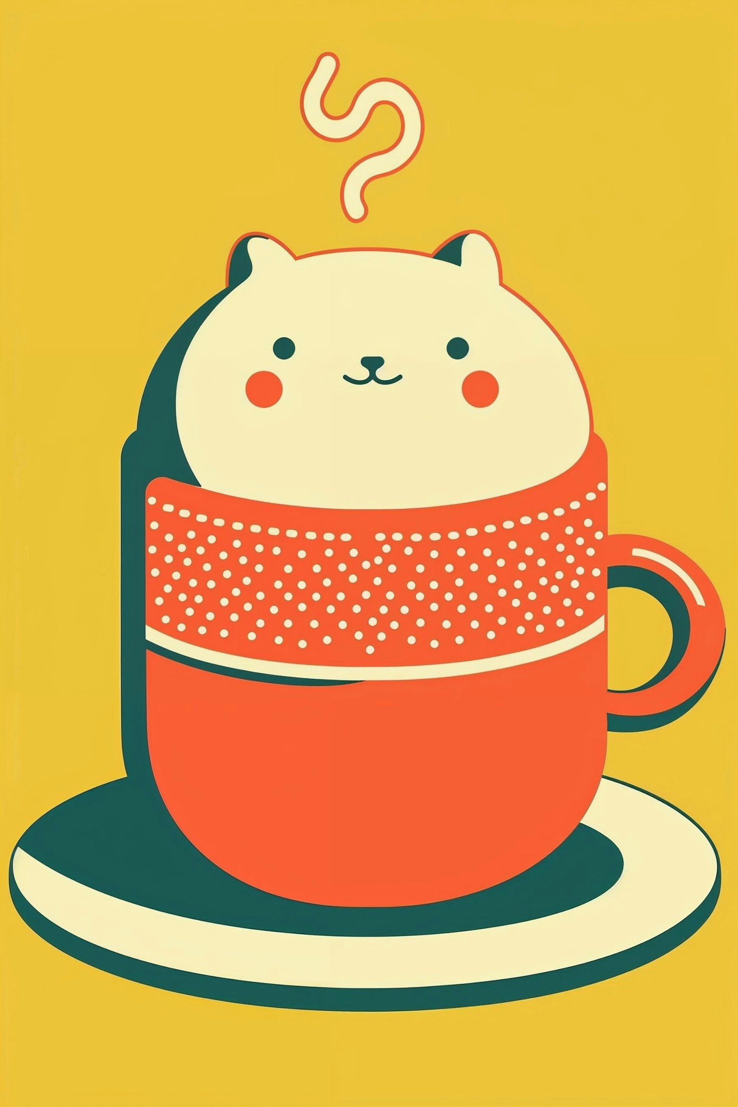 Cute illustration of a cat in a red coffee cup with a yellow background. Playful design with steam swirl and dotted pattern on the cup.