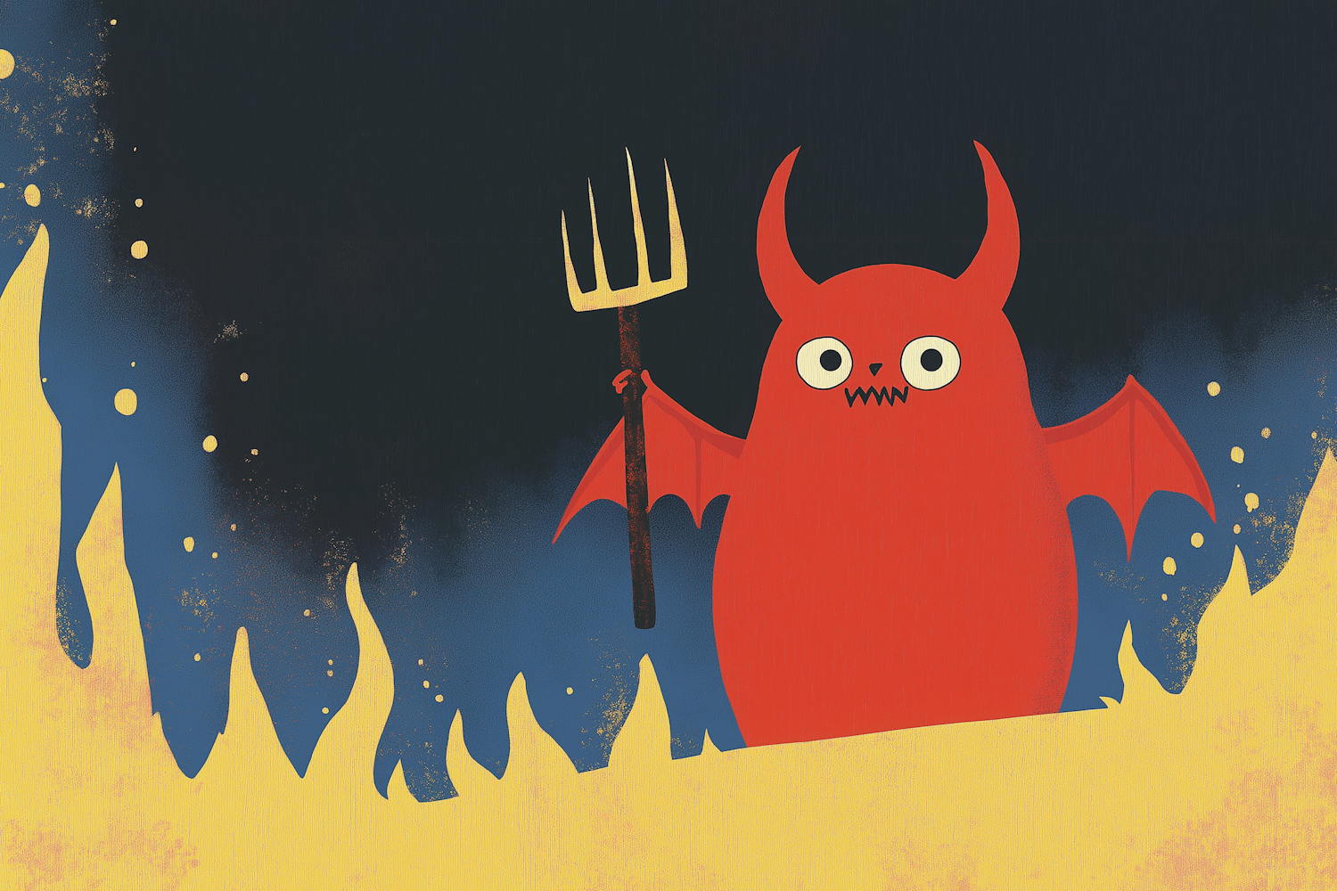 Cartoonish red devil with pitchfork amidst yellow flames and dark smoky background, creating a dramatic and whimsical scene.