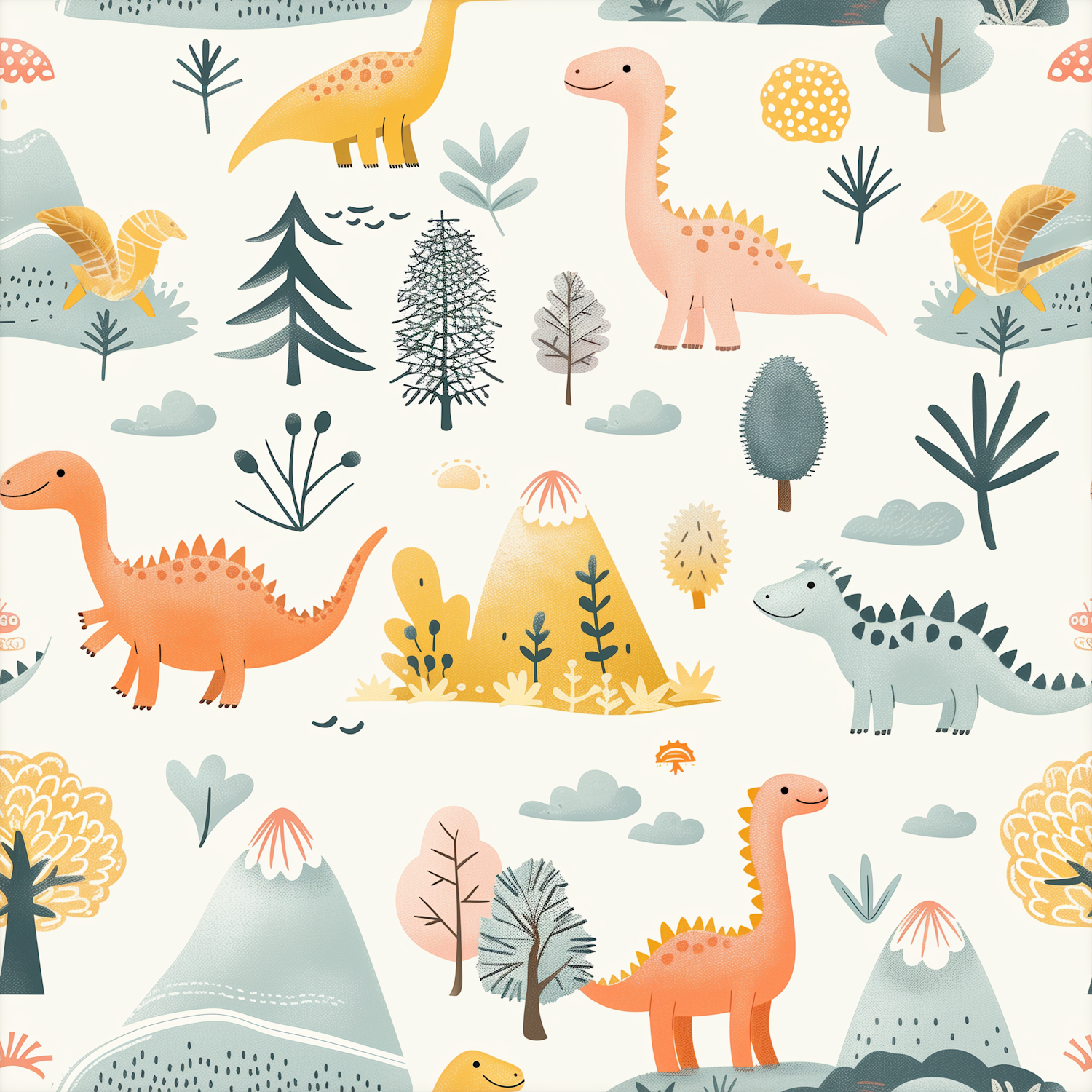 Colorful cartoon dinosaurs in a playful prehistoric landscape with trees and mountains, perfect for kids' decor.