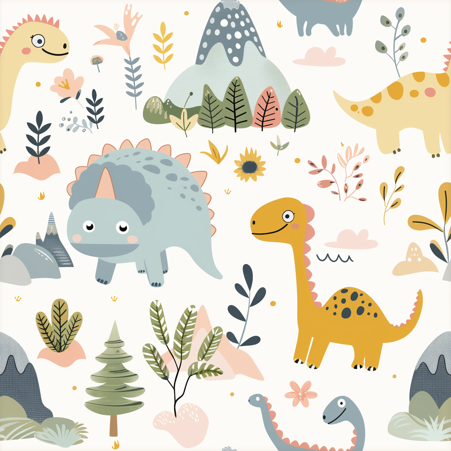 Whimsical cartoon dinosaurs in pastel colors with playful expressions, surrounded by stylized plants and mountains.