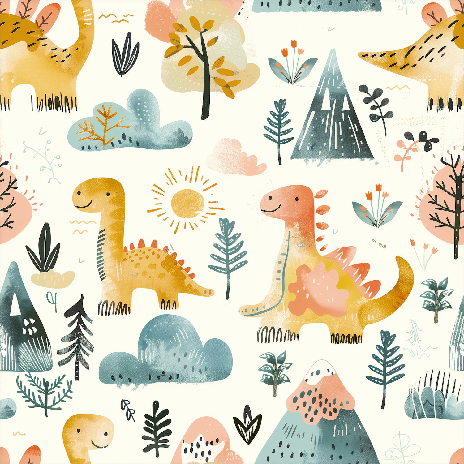 Playful pastel dinosaur illustration with trees, mountains, and clouds in a whimsical prehistoric landscape. Perfect for kids' decor.