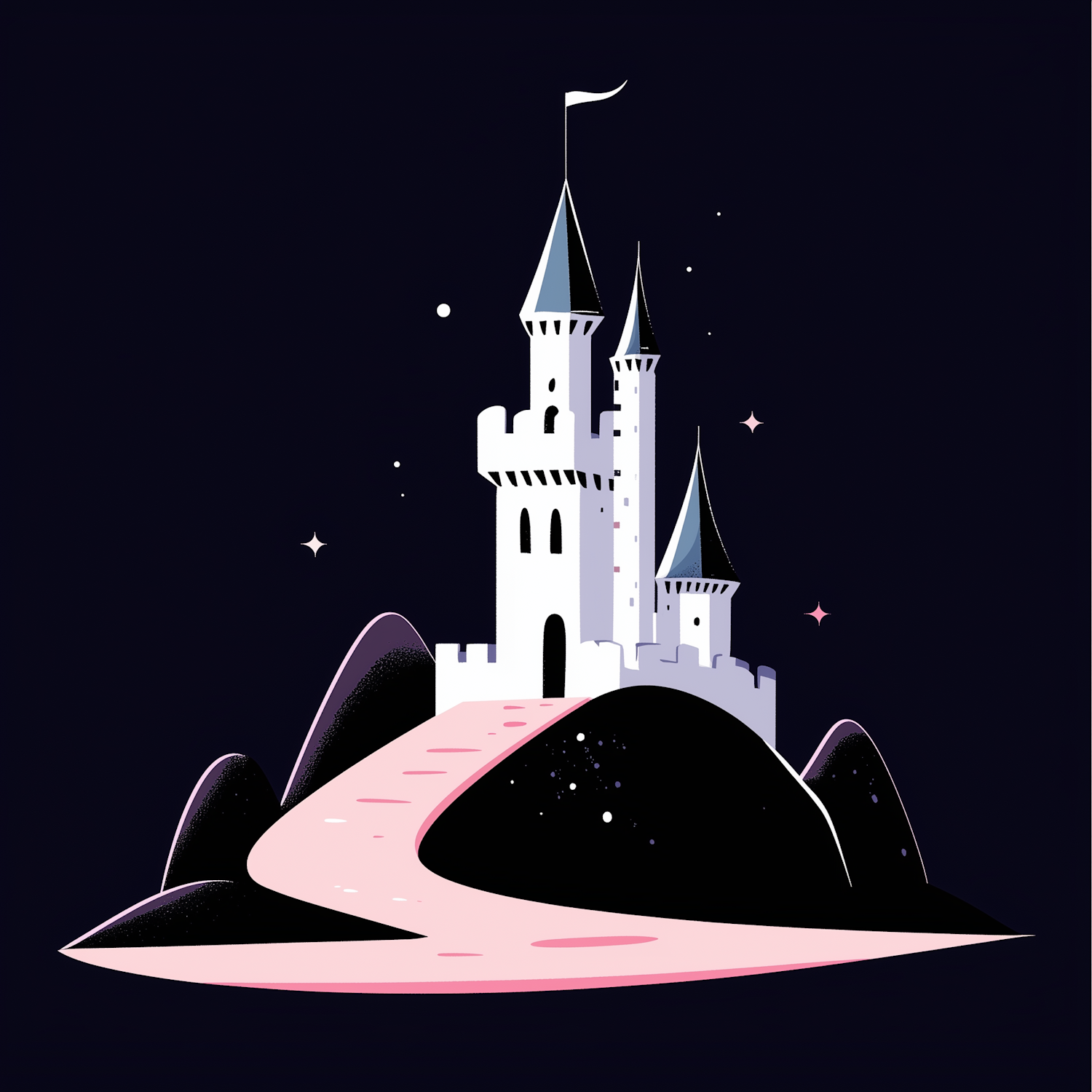 Whimsical fairytale castle illustration with tall towers, set against a starry night sky. Enchanting and minimalist design.