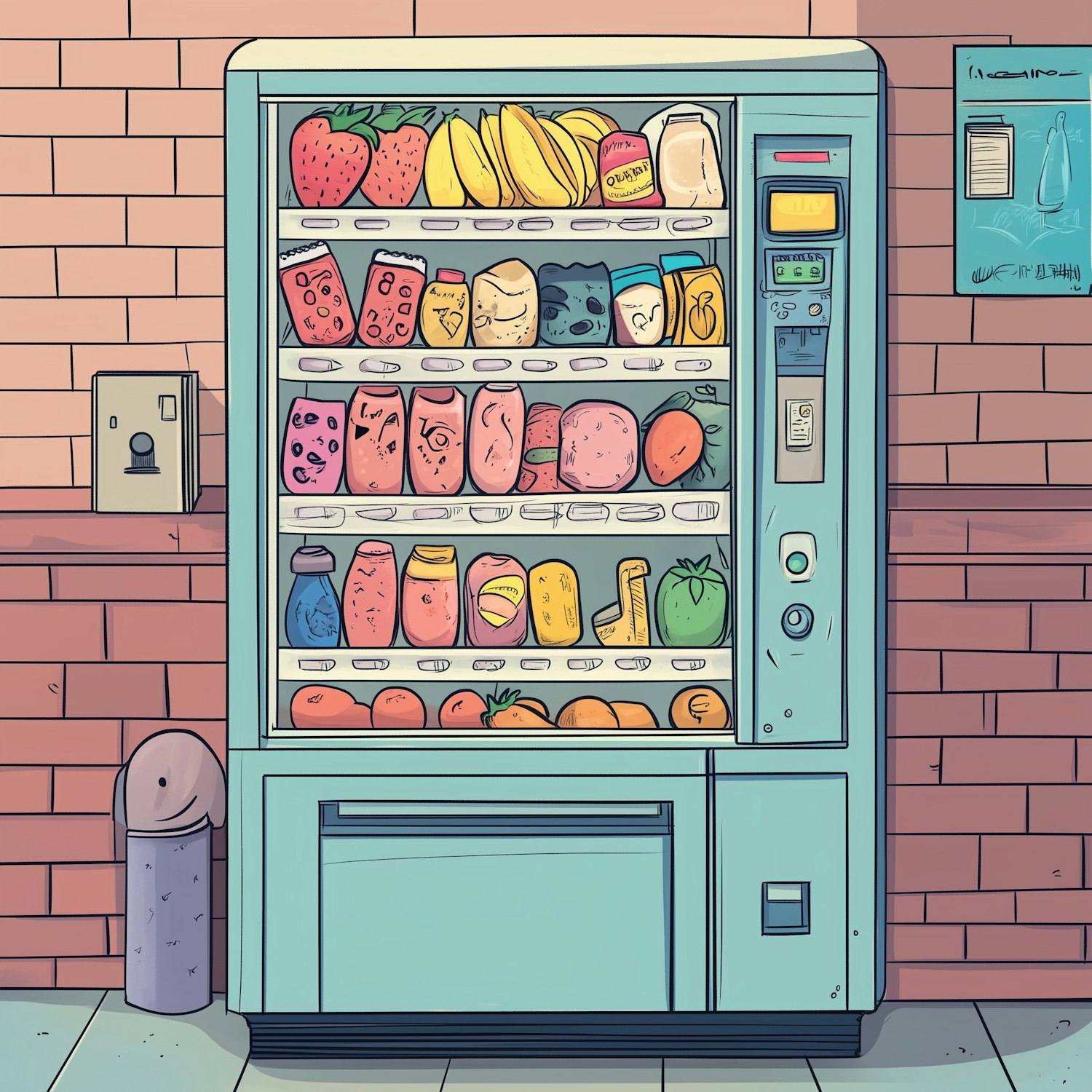 A playful vending machine illustration stocked with fruits, veggies, and jars, set against a brick wall with pastel tones.
