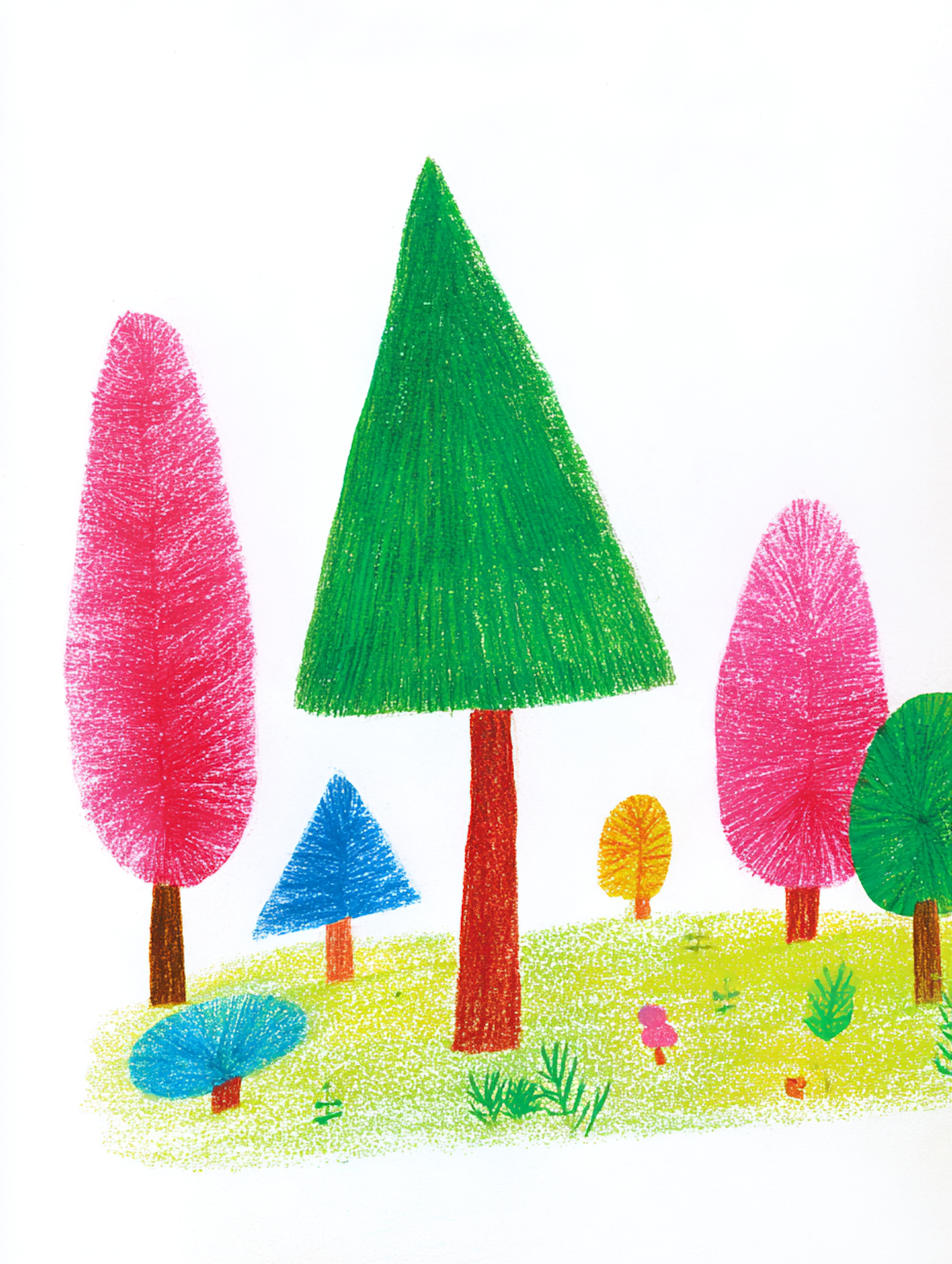 A vibrant crayon-style illustration of colorful trees and a whimsical forest scene on a white background.