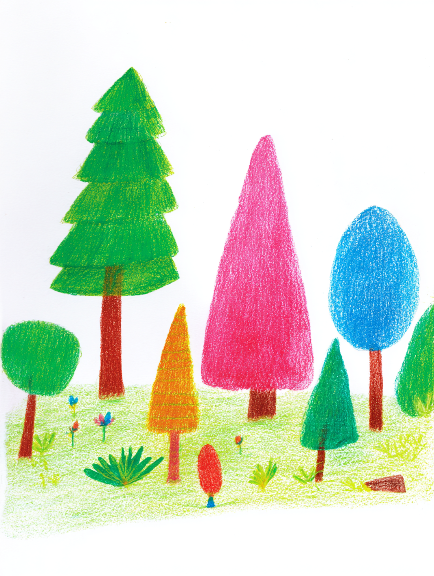 A vibrant illustration of a whimsical forest with colorful trees and plants, showcasing a playful and imaginative design.