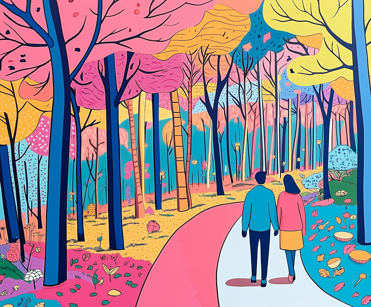 Whimsical illustration of a couple walking in a colorful, dreamlike forest with vibrant trees and a serene atmosphere.