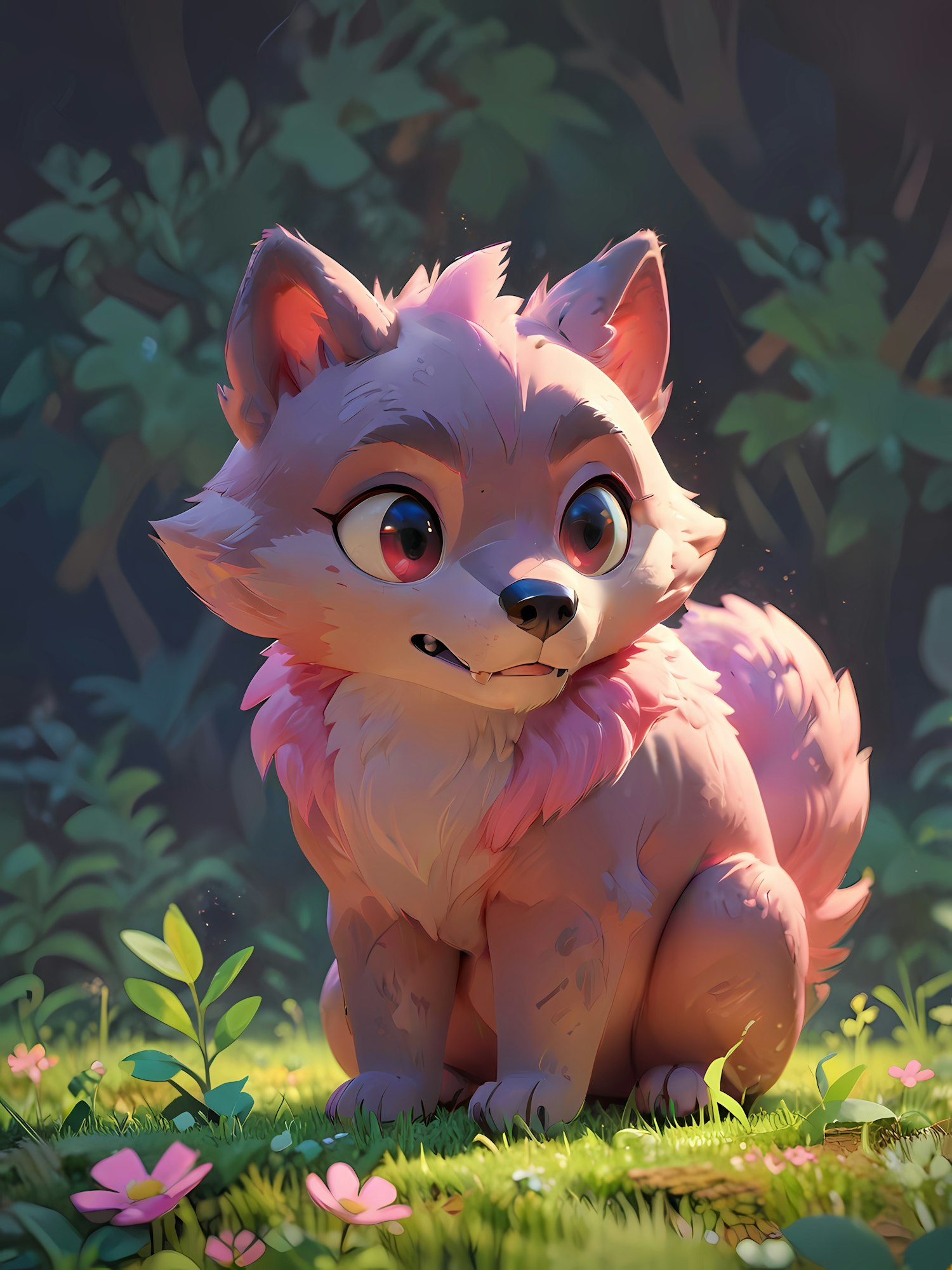 Adorable pink and cream fox-like creature in a sunlit forest clearing, surrounded by vibrant greenery and flowers. Whimsical and enchanting!