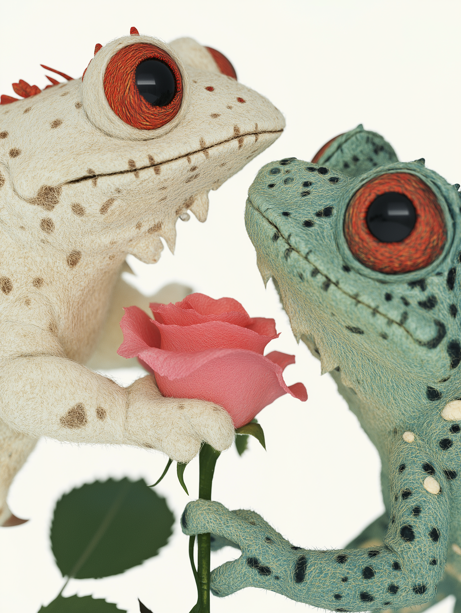Two cartoon-like frogs with large eyes hold a pink rose together, creating a whimsical and romantic scene.