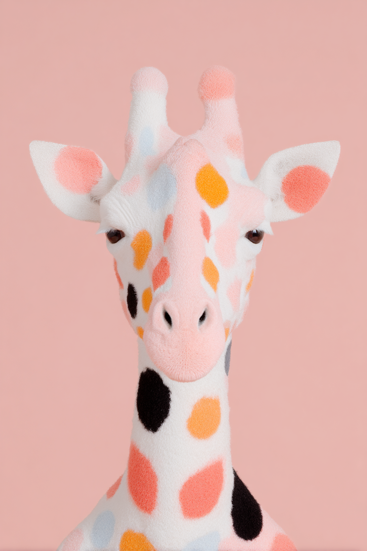 A pastel-colored giraffe with playful spots on a soft pink background, creating a whimsical and artistic vibe.