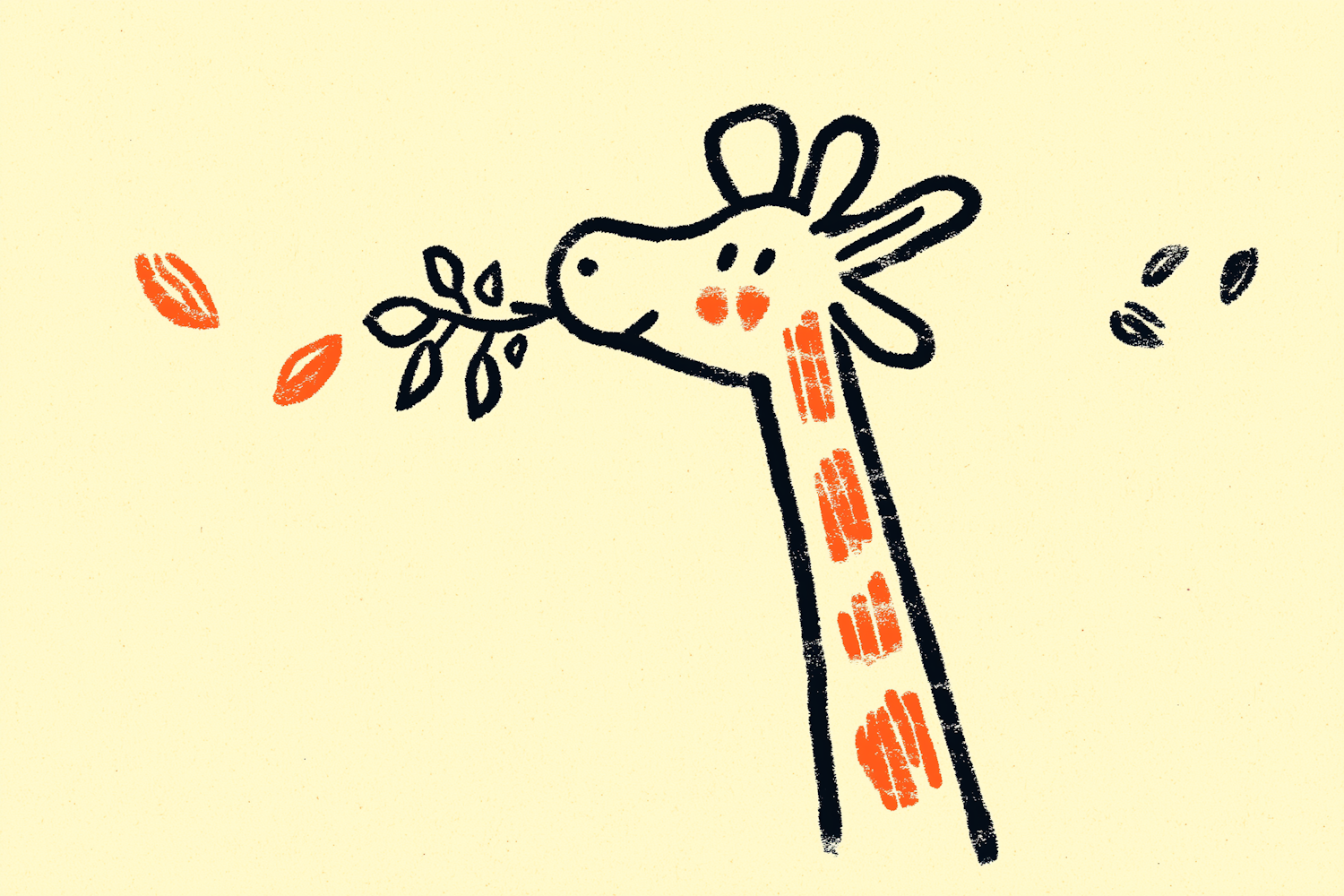 Playful illustration of a giraffe with orange spots, holding a leafy branch. Minimalistic and cheerful design on a cream background.