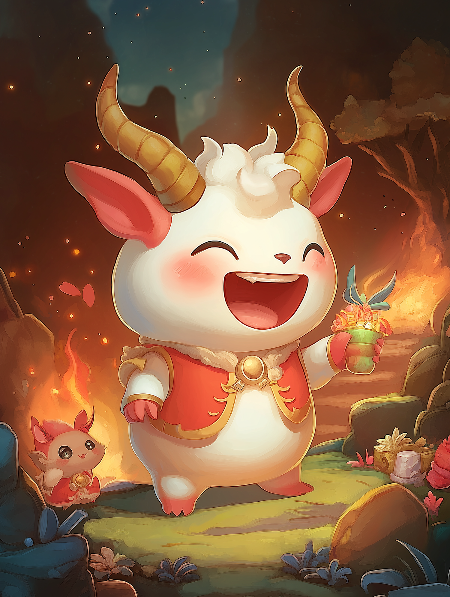 Adorable goat-like creatures in a magical forest, glowing campfire, and vibrant plants create a whimsical, heartwarming scene.
