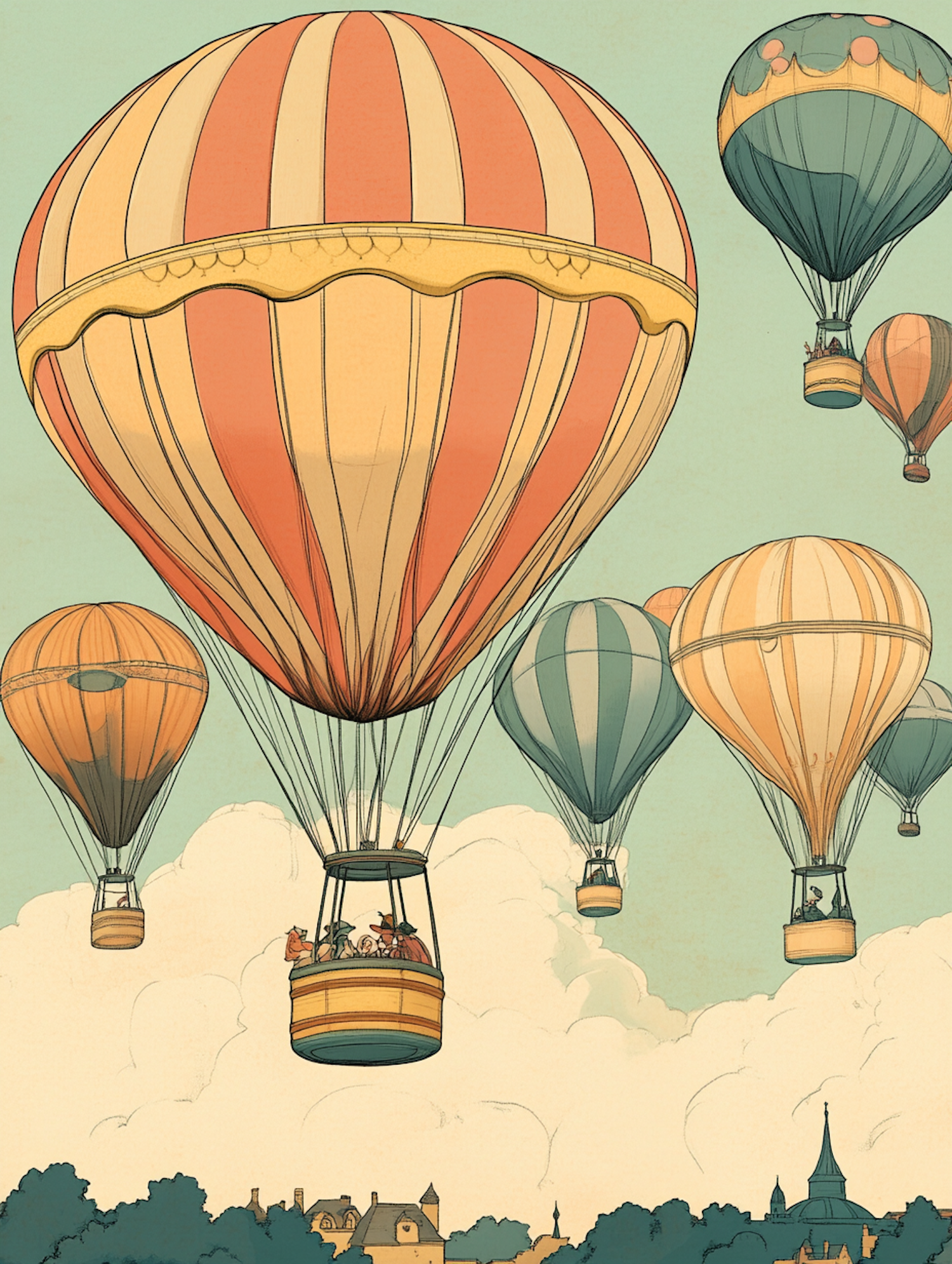 Whimsical illustration of colorful hot air balloons floating over a quaint village, set against a pastel sky with fluffy clouds.