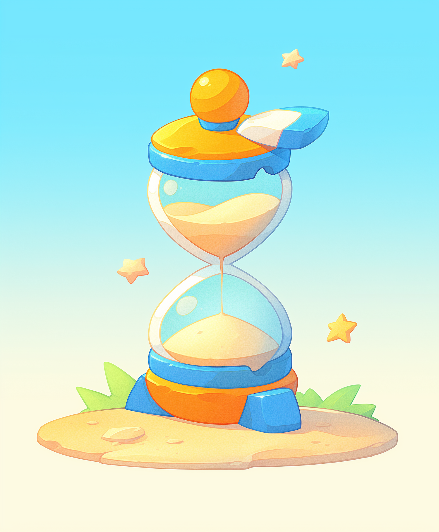 Colorful illustration of a whimsical hourglass with flowing sand, set against a blue sky with floating stars and a sandy base.