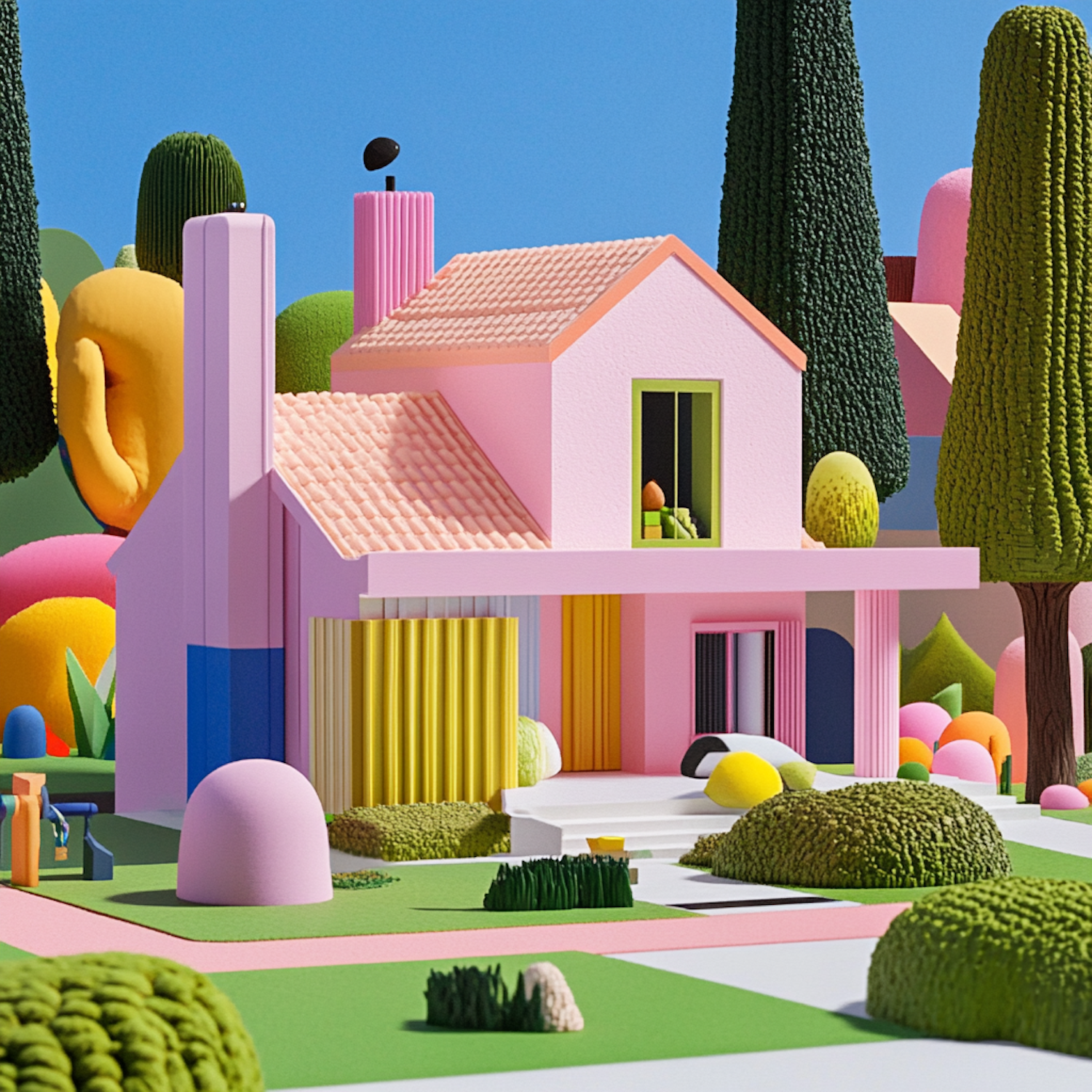 A playful, pastel-colored house surrounded by whimsical, textured trees and bushes under a bright blue sky. Vibrant and surreal design.