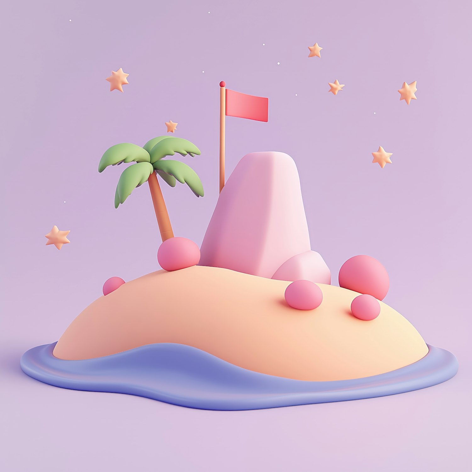 Whimsical 3D illustration of a pastel island with palm trees, a pink hill, and a lavender sky filled with glowing stars.