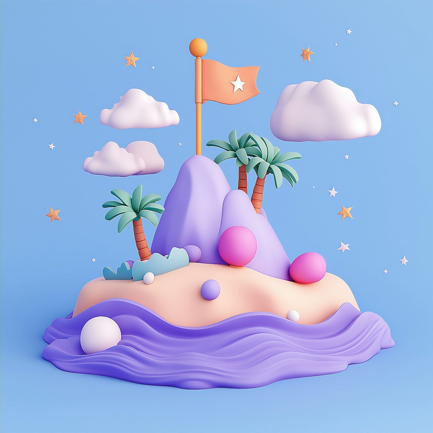 Whimsical 3D island scene with pastel colors, palm trees, a starry flag, and purple waves under a dreamy blue sky with clouds and stars.