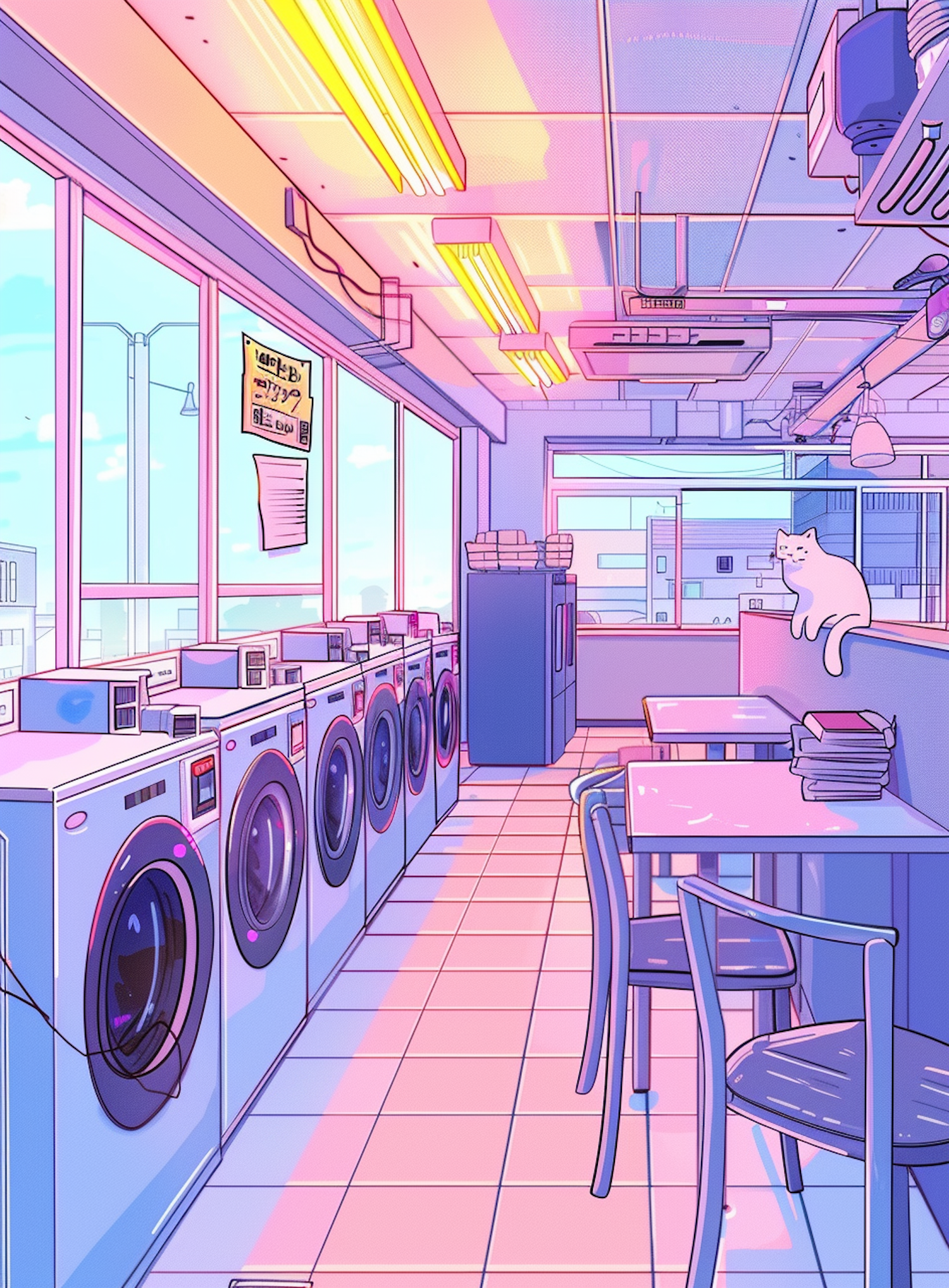A pastel-colored laundromat with washing machines, a relaxed cat, and soft lighting creating a serene atmosphere.
